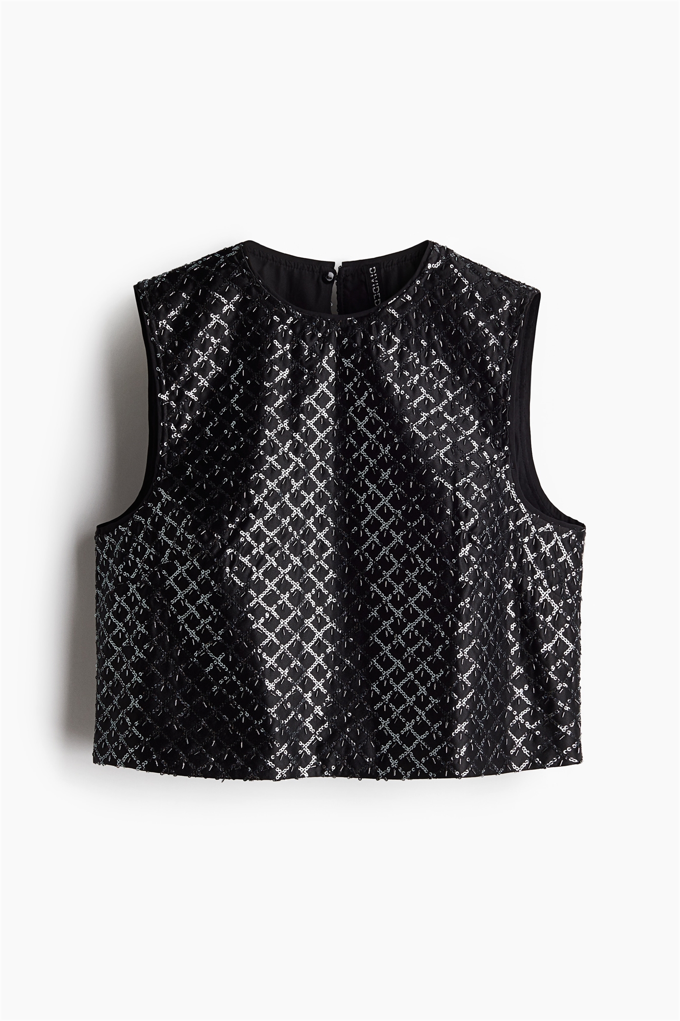 Короткий жилет-топ из тканого материала, украшенный мелкими бусинками и мерцающими пайетками, образующими ромбовидный узор. Круглый вырез, разрез и потайная пуговица сзади на шее. Подол прямого кроя. На подкладке.