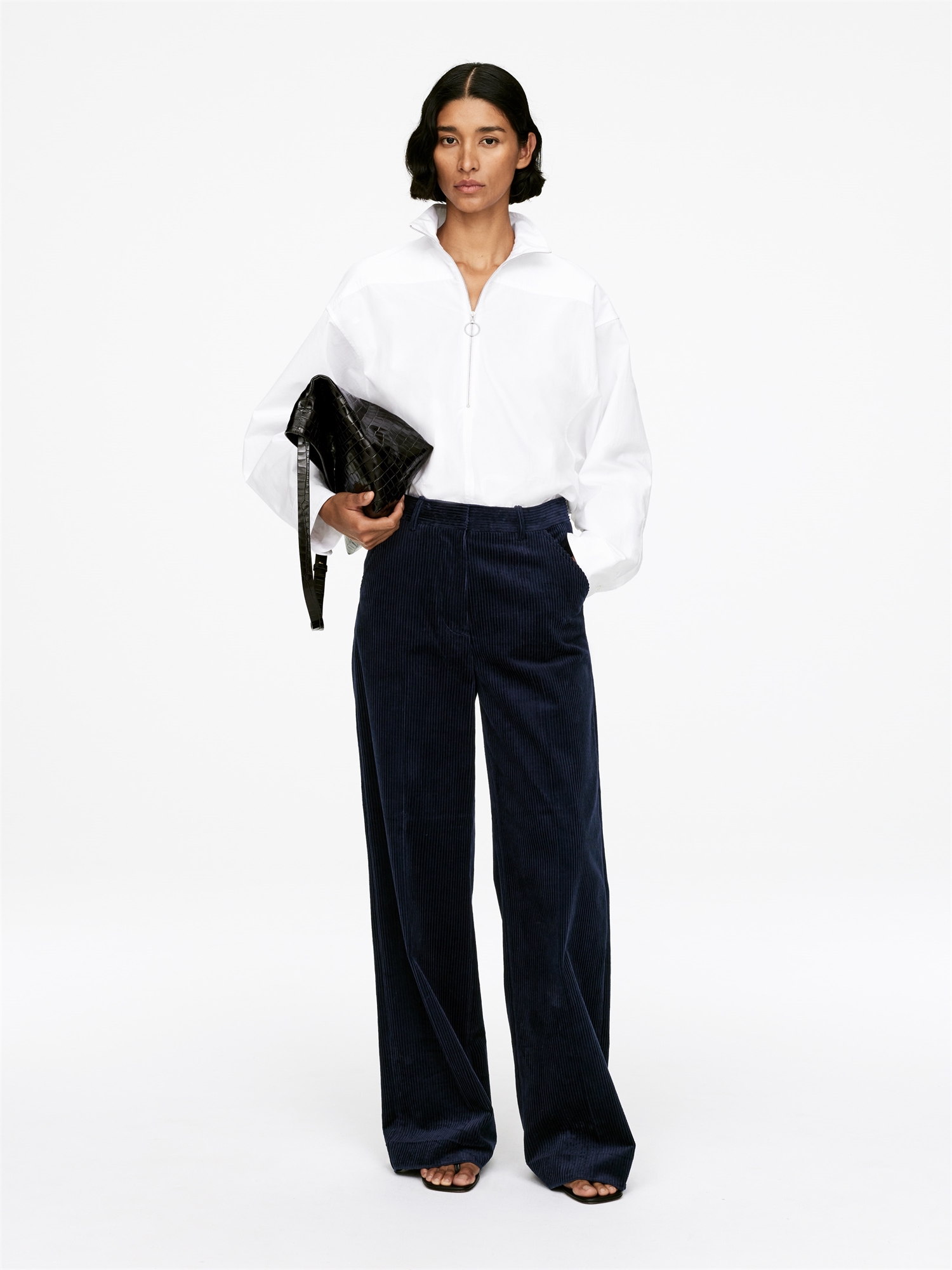Приталенные вельветовые брюки со складками спереди и сзади. Косые боковые карманы и накладные карманы сзади. Широкие штанины и застежка на крючки и глазки.