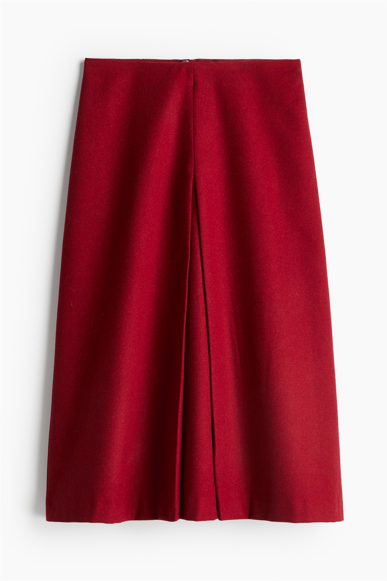 Юбка длиной до колена из тканого материала с потайной застежкой на молнию сзади на талии и перевернутой складкой спереди, создающей силуэт А-линии.
