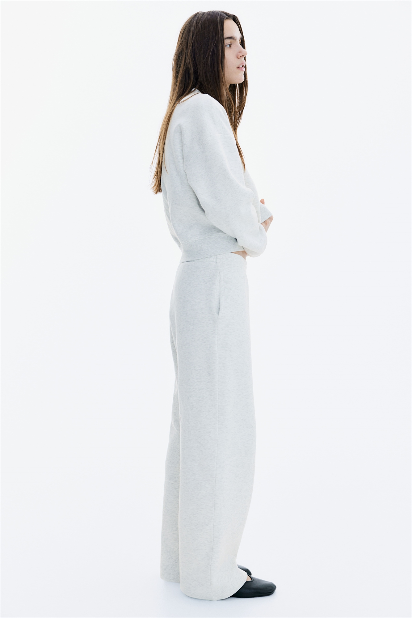 Комплект из топа и джоггеров из толстовки с мягкой ворсистой внутренней стороной. Топ с круглым вырезом в рубчик, спущенными плечами, длинными рукавами и окантовкой на манжетах и подоле. Джоггеры с эластичной вставкой на талии, неброскими боковыми карманами и прямыми ногами.