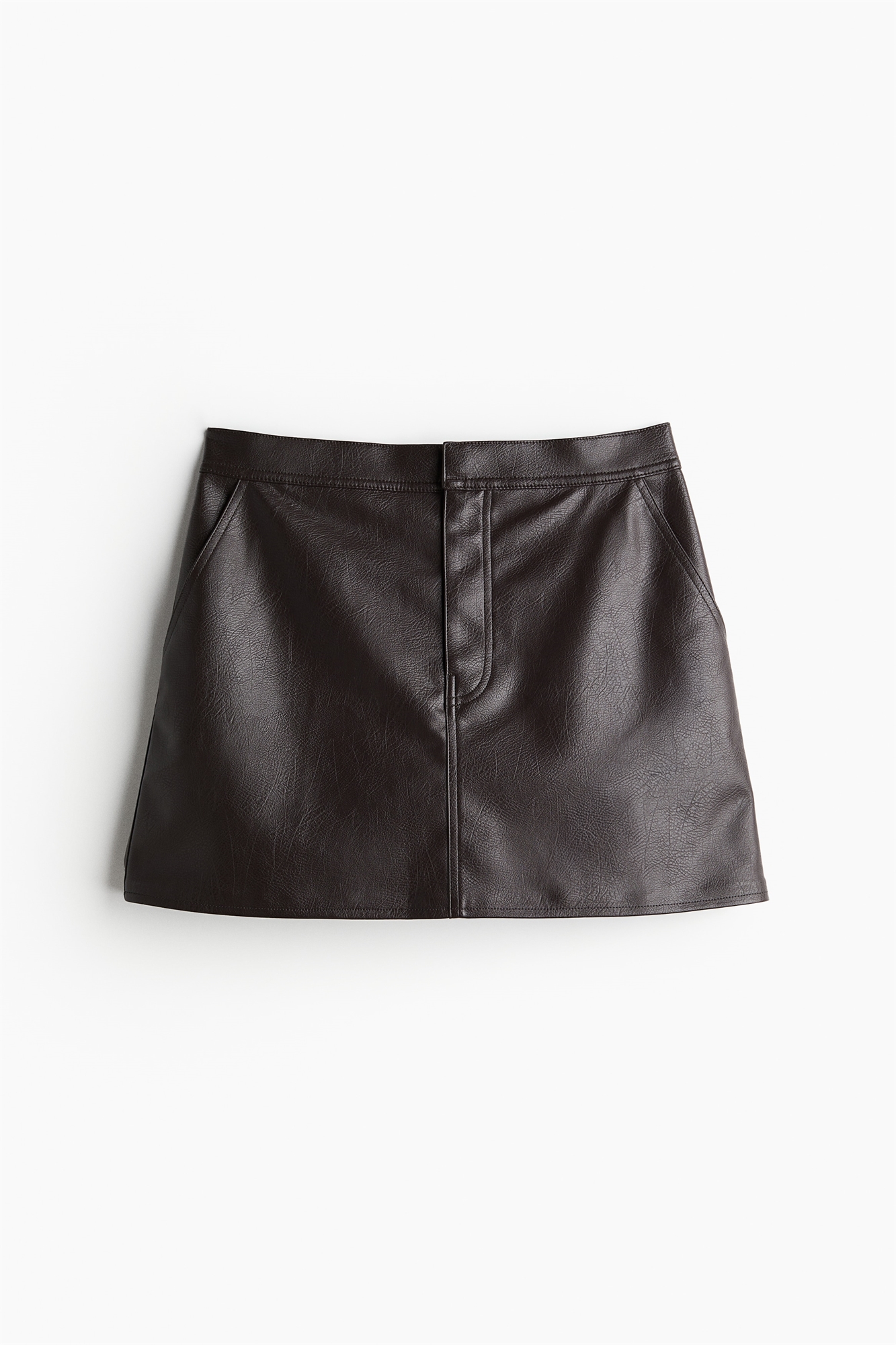 Короткая приталенная юбка из ткани с покрытием, диагональные боковые карманы и ширинка на молнии с потайной кнопкой.