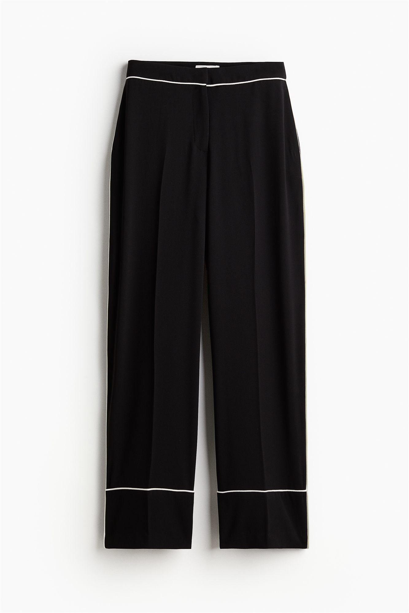 Приталенные брюки из крепового полотна с акцентной цветной отделкой. Высокая талия, ширинка на молнии, потайная застежка на пуговицах и крючках. Небрежные боковые карманы, втачные задние карманы и прямые ноги со складками спереди и сзади.