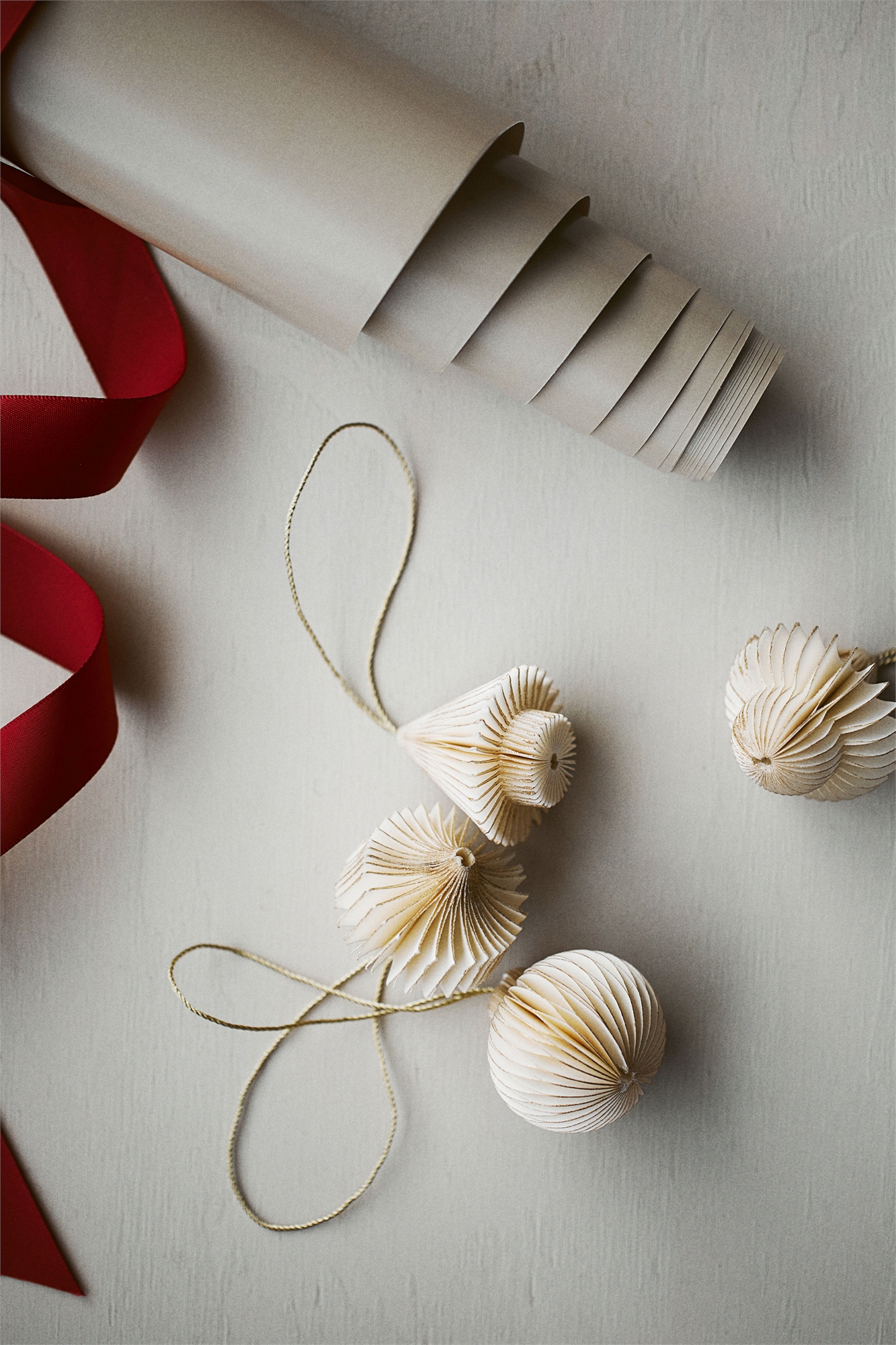 Украшения из бумаги различной формы. Сверху нитка для подвешивания.