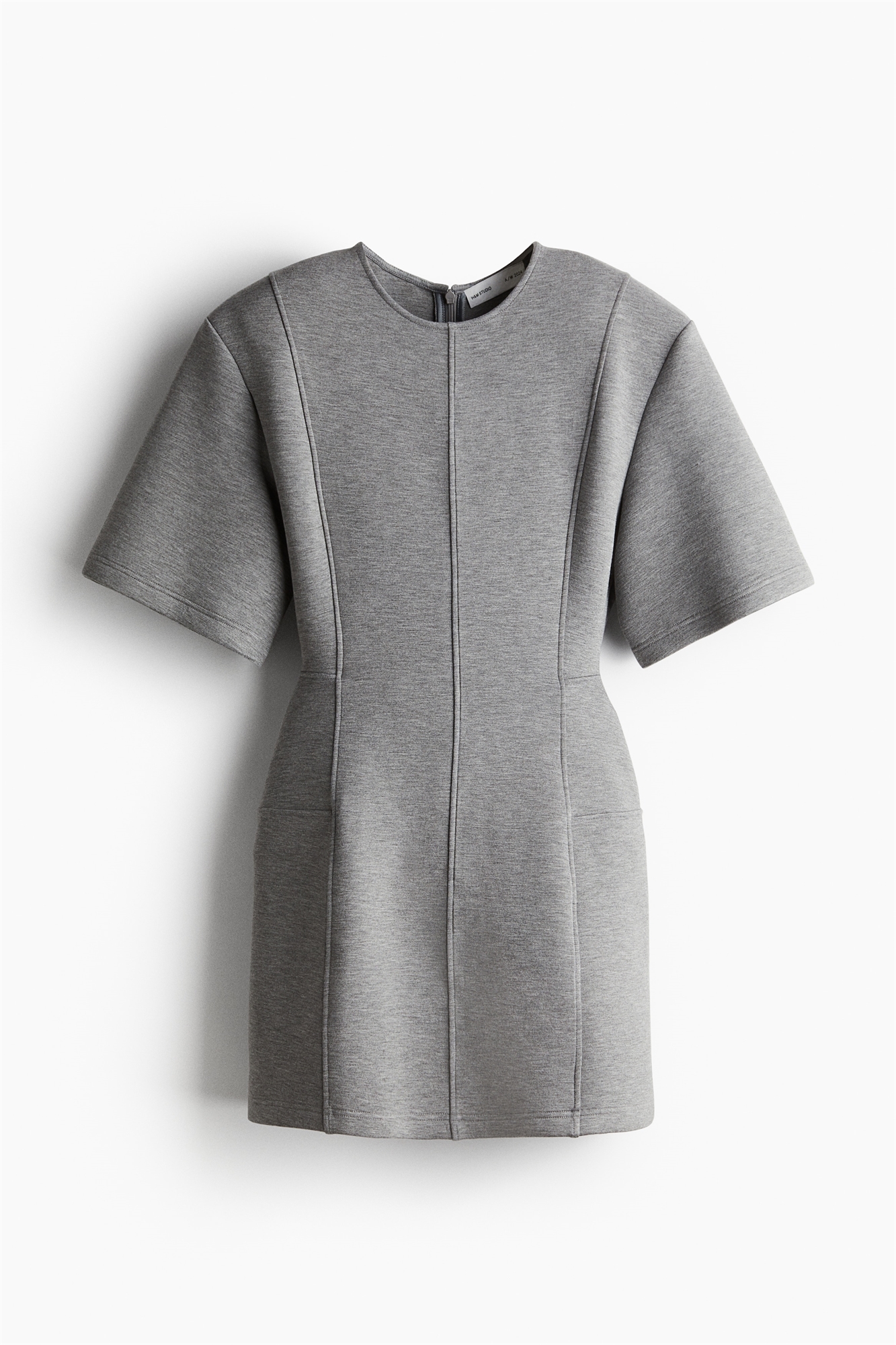 Studio Collection. Платье-футболка мини из супермягкого вискозного джерси-скуба с заниженной талией, вставками на бедрах и формирующими швами спереди и сзади, создающими по-настоящему четкий силуэт песочных часов. Короткие рукава, заканчивающиеся чуть выше локтей, и потайная застежка-молния сзади.