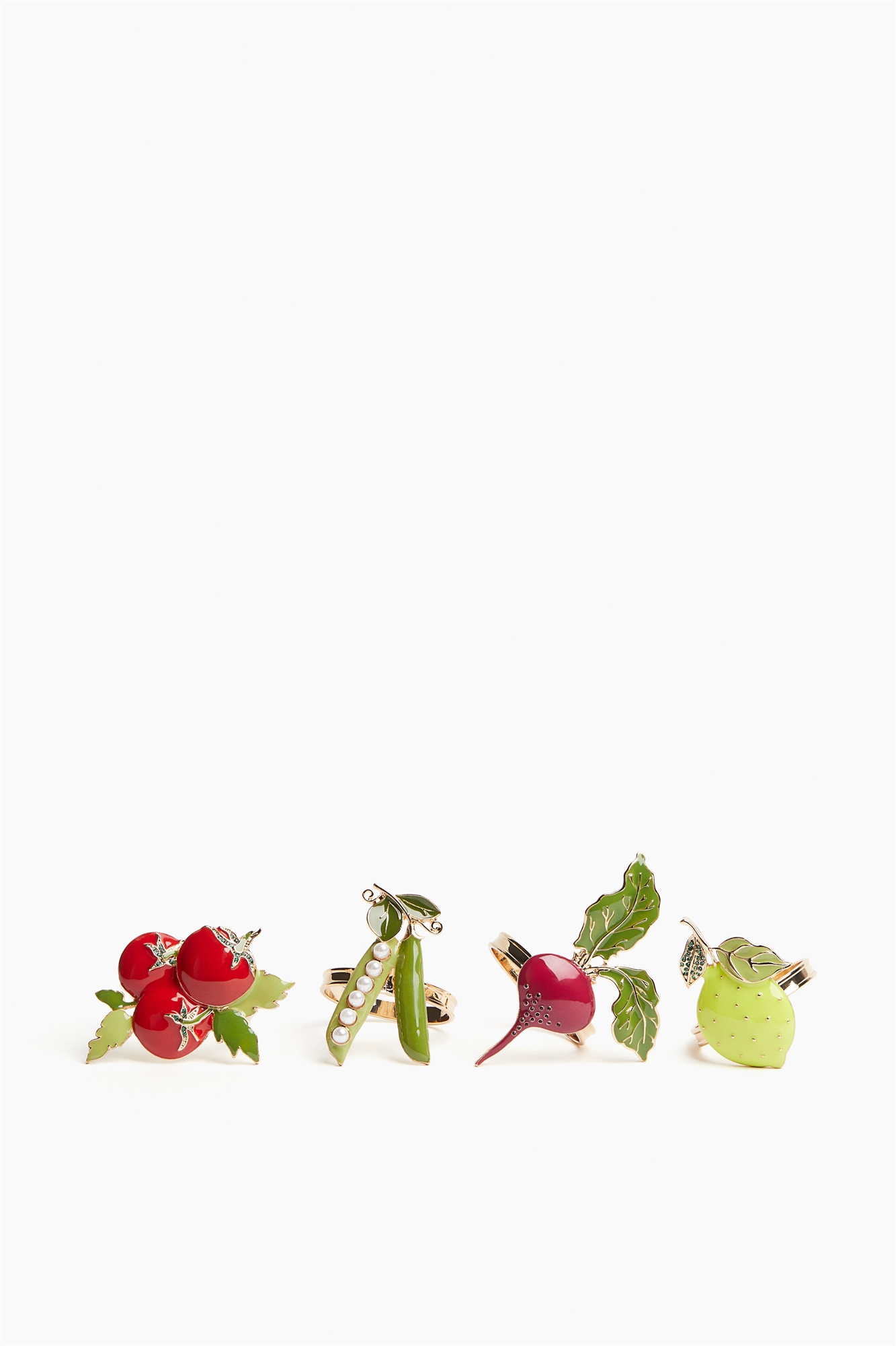 Набор из 4 металлических колец для салфеток с деталями в форме овощей. Диаметр 4,3 см.