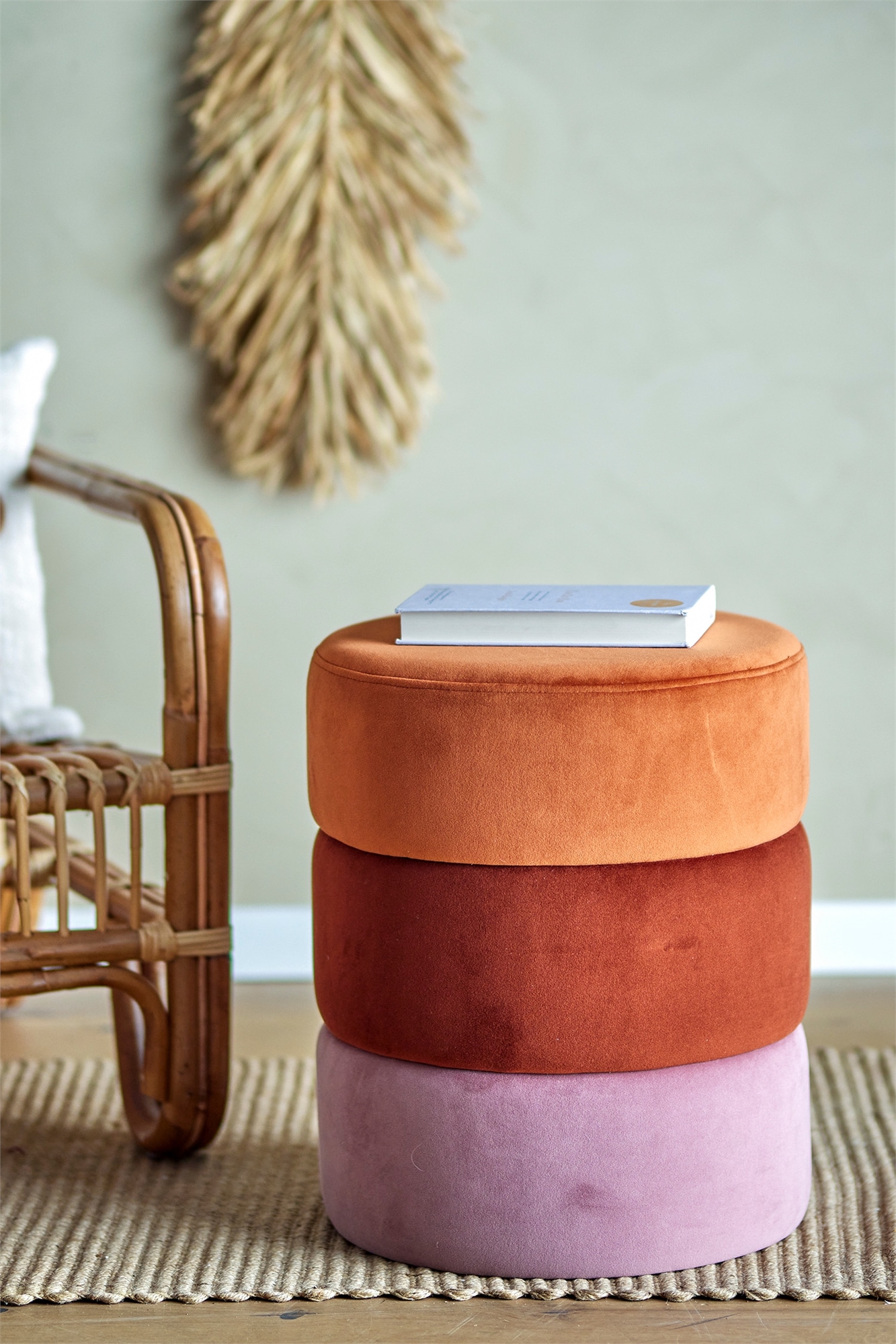 Пуф Bilbao от Bloomingville идеально подходит для создания индивидуального интерьера. Он обтянут велюровой тканью трех сочетающихся теплых цветов и создает уютную атмосферу. Используйте его как дополнительное сиденье, подставку для ног, практичный пуф или как декоративную точку в комнате.D37xH45 см.