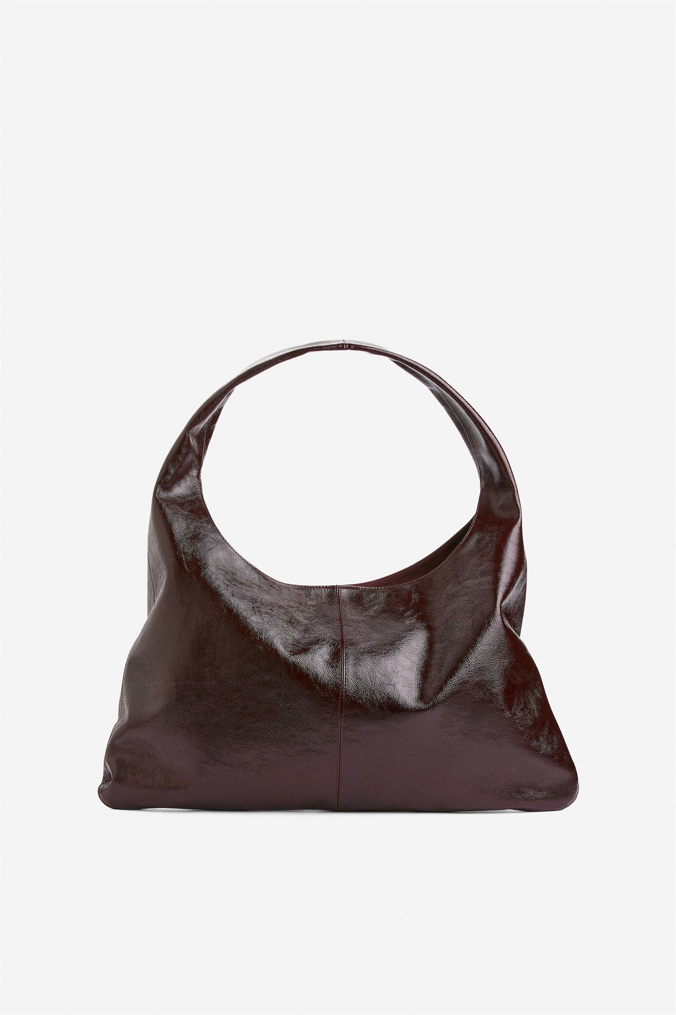 Кожаная сумка с блестящей отделкой. Плоский фасон с сутулым видом при ношении на плече. Декоративная строчка по центру. Магнитная застежка и внутренний карман без молнии. Ширина 54 см, высота 31 см, спад 17 см.