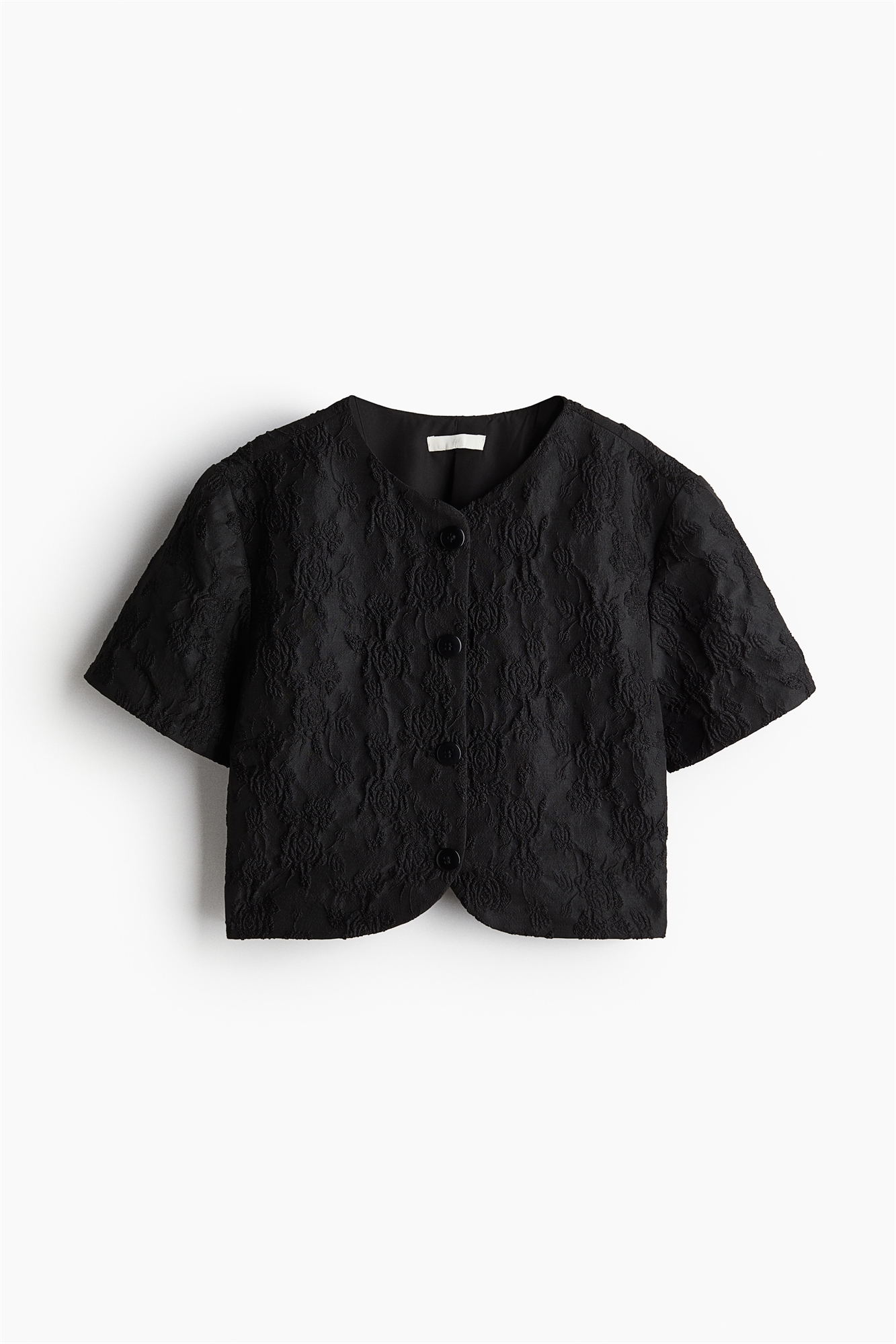 Приталенная блузка из тканого материала с круглым вырезом, пуговицами спереди и короткими рукавами. На подкладке.
