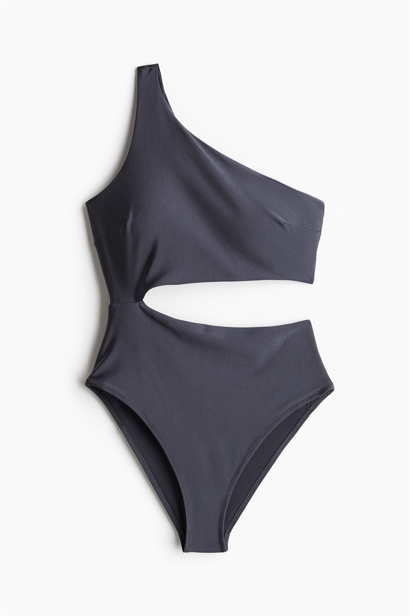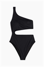 Полностью закрытый купальник на одно плечо с асимметричным вырезом и одной широкой бретелью. Перекрученная деталь сзади и вырез на талии. Чашечки со съемными вставками, придающими форму бюсту и обеспечивающими хорошую поддержку. Ноги с высоким вырезом и вырезом сзади.