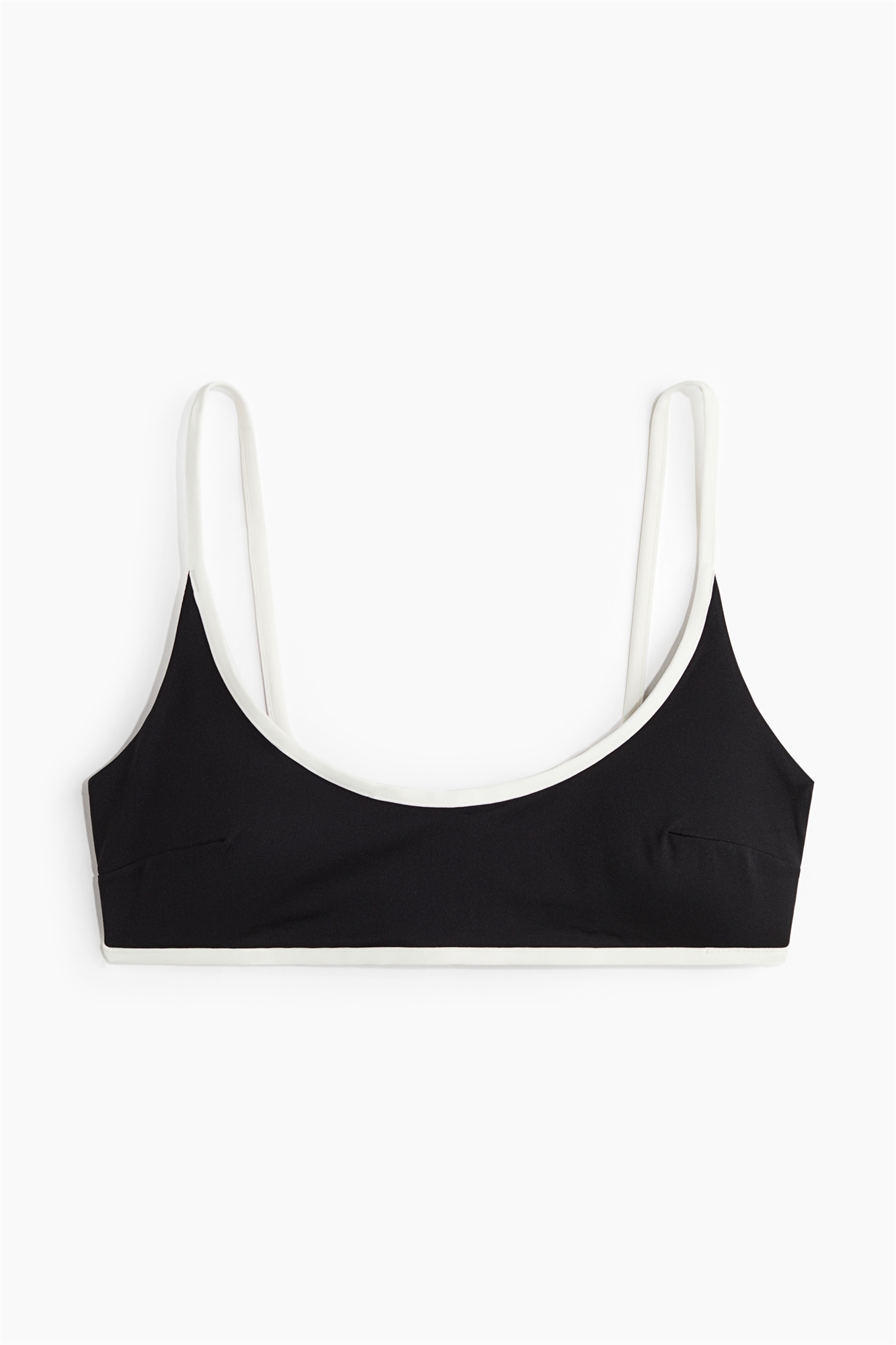 Бикини на подкладке, без проводов, с узкими бретелями и чашечками со съемными вкладышами, которые формируют бюст и обеспечивают хорошую поддержку. Металлическая застежка сзади.