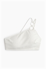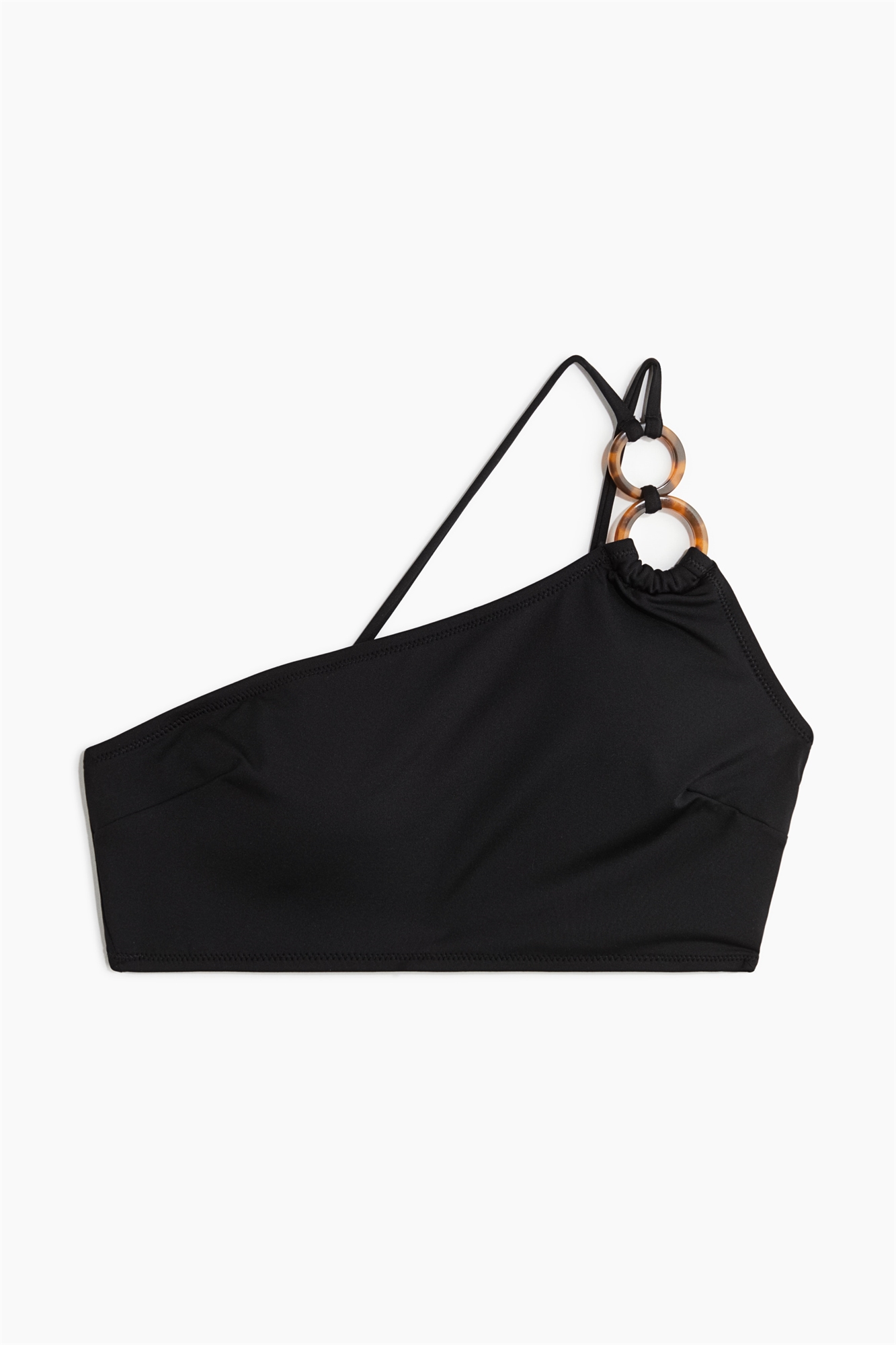 Асимметричный бикини-топ на подкладке с двойными бретелями на одном плече и декоративными кольцами спереди. Чашечки со съемными вставками, придающими форму бюсту и обеспечивающими хорошую поддержку. Без застежек.