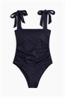 Полностью закрытый купальник с бретелями на завязках и чашечками со съемными вкладышами, которые формируют бюст и обеспечивают хорошую поддержку. Сборки по бокам для создания привлекательного силуэта и средняя степень защиты сзади.