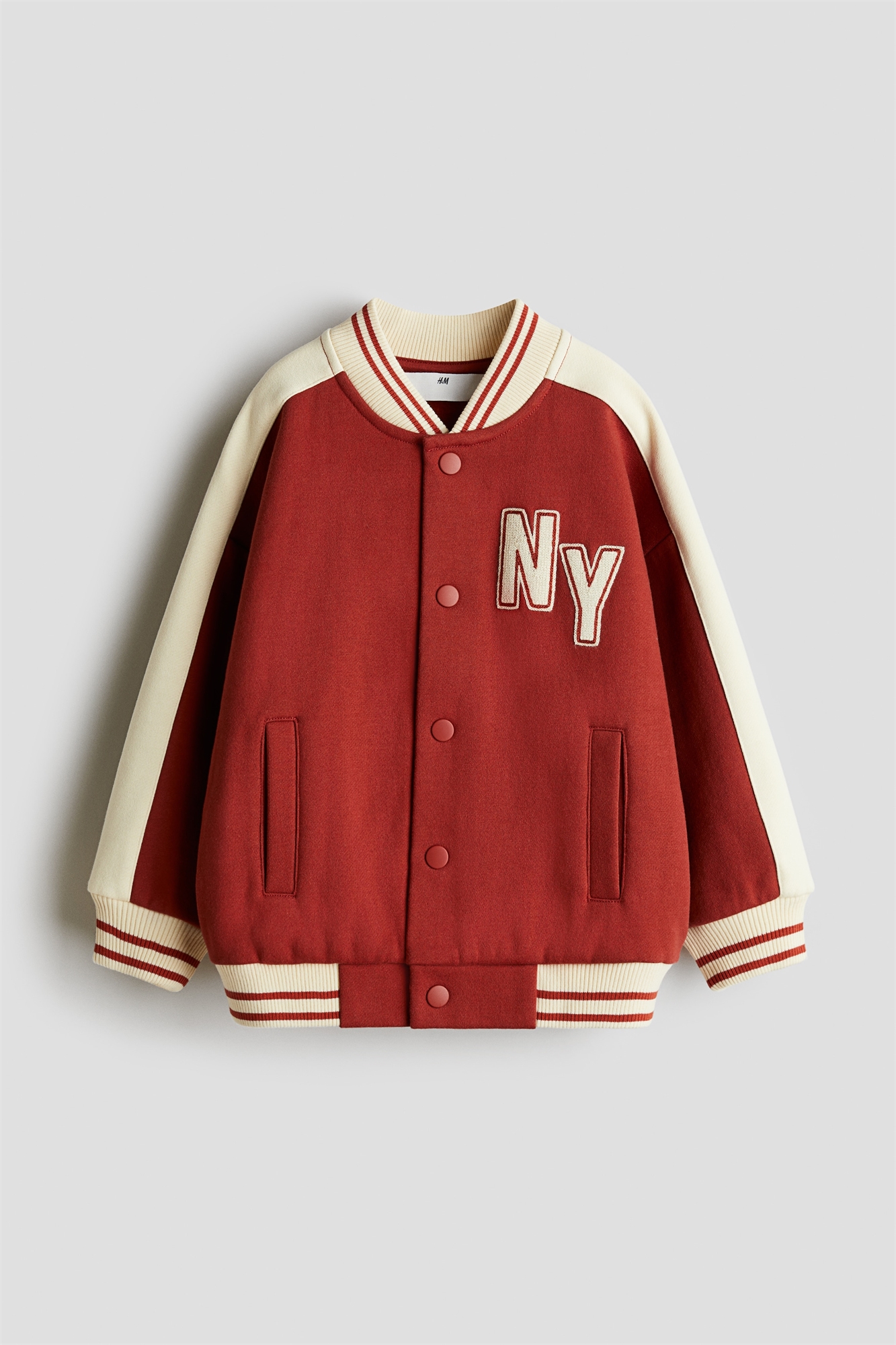 Бейсбольная куртка блочного цвета из толстовочной ткани с мягкой начесом внутри и текстовыми мотивами спереди и сзади. Ребристый воротник-стойка, кнопки спереди и прорезные боковые карманы. Ребристые манжеты и подол.