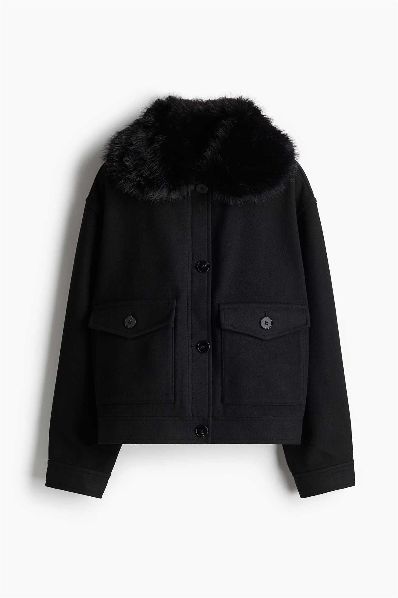 Свободный жакет из саржи с начесом. Пушистый отложной воротник, пуговицы спереди и ярмо сзади. Спущенные плечи, манжеты на пуговицах и накладные передние карманы на пуговице. На подкладке.