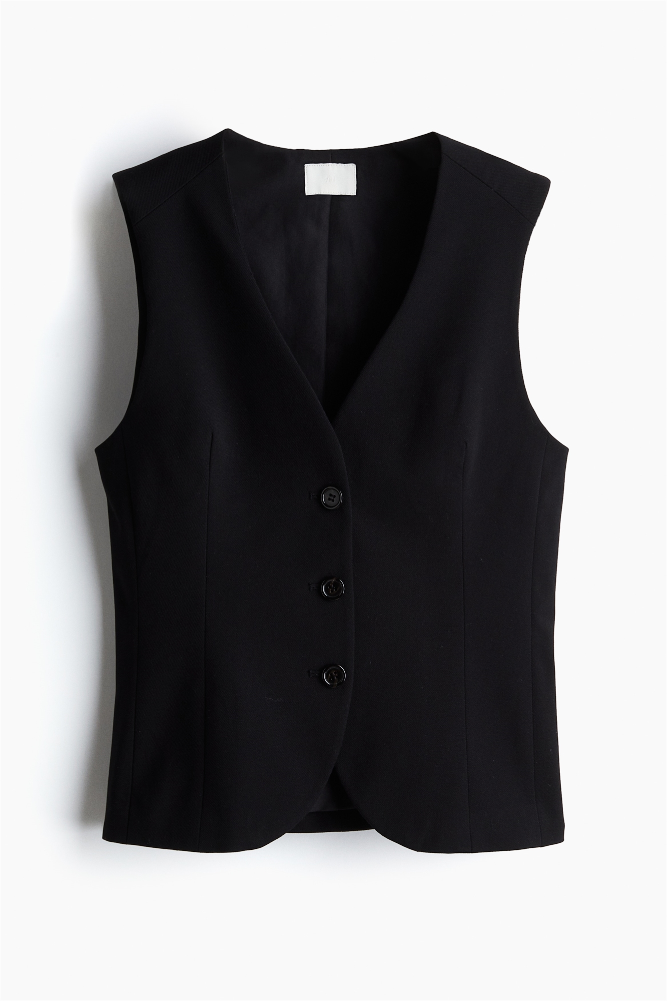Приталенный жилет из тканого материала с V-образным вырезом и пуговицами спереди. Направленные вперед плечевые швы и формирующие вытачки спереди. На подкладке.
