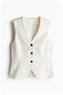 Приталенный жилет из тканого материала с V-образным вырезом и пуговицами спереди. Направленные вперед плечевые швы и формирующие вытачки спереди. На подкладке.