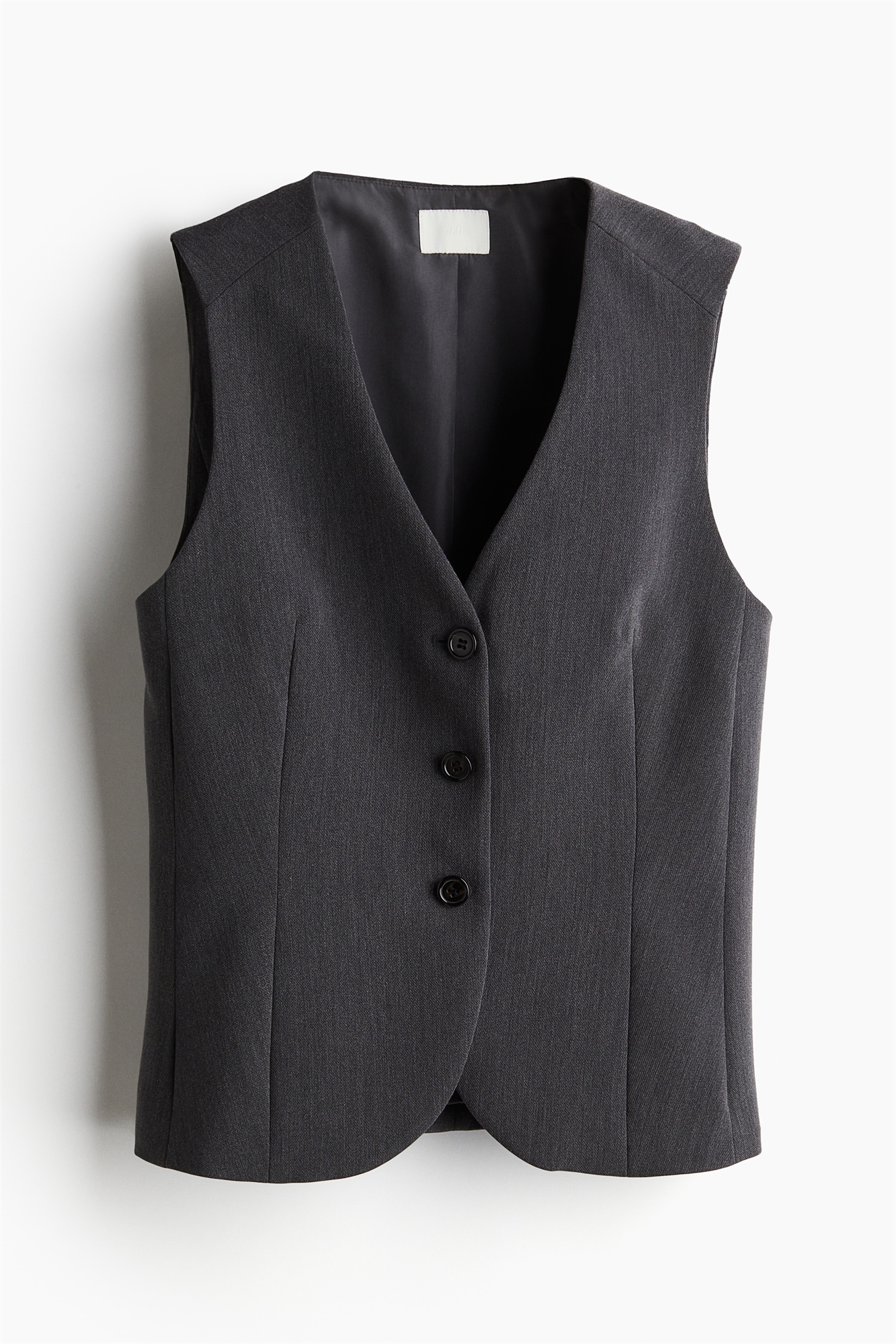 Приталенный жилет из тканого материала с V-образным вырезом и пуговицами спереди. Направленные вперед плечевые швы и формирующие вытачки спереди. На подкладке.