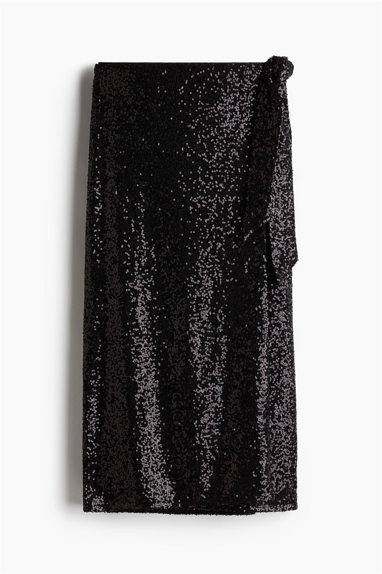 Юбка длиной до колена из сетки с блестками, с высокой талией и широкими завязками с одной стороны. На подкладке.