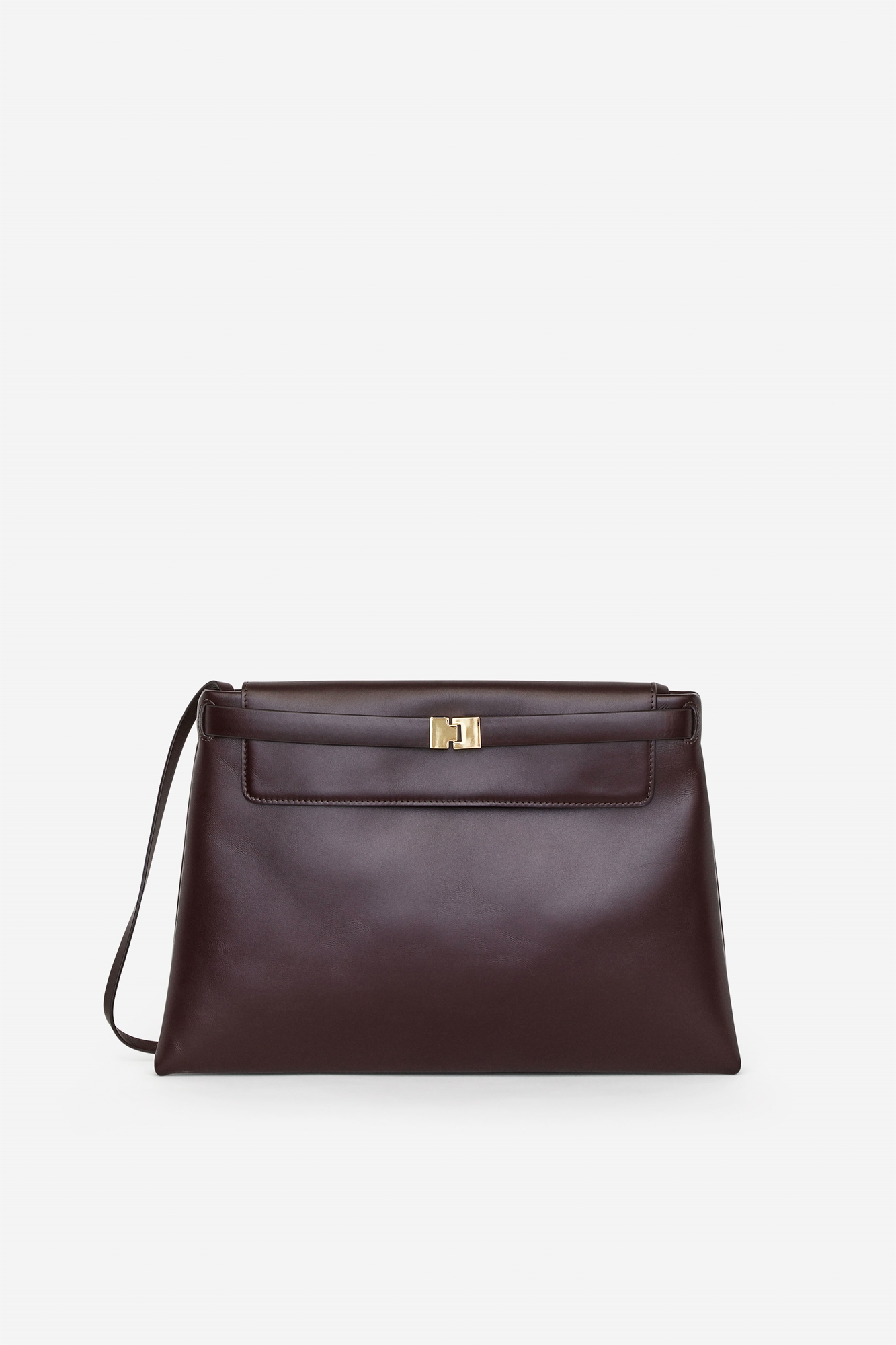 Сумка из кожи, не содержащей хрома. Съемный ремень с позолоченной пряжкой вокруг верхнего клапана. Съемный плечевой ремень и застежка-молния. Сумку можно носить как клатч или на плече. Размеры 39 x 25,5 см.