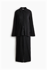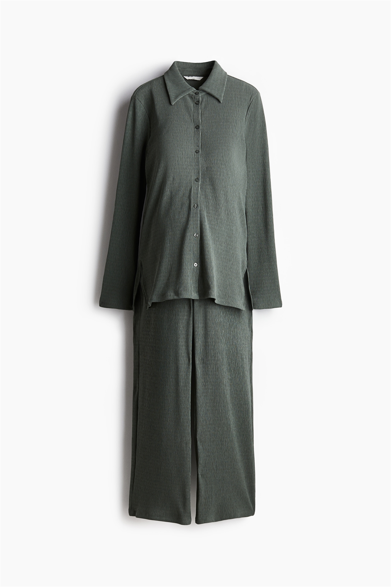 Комплект из топа с длинными рукавами и брюк из фактурного трикотажа. Топ с воротником, застежкой на пуговицы спереди и прямым подолом с разрезом с каждой стороны. Брюки с заниженной эластичной талией и прямыми ногами. Комплект можно носить как во время, так и после беременности.