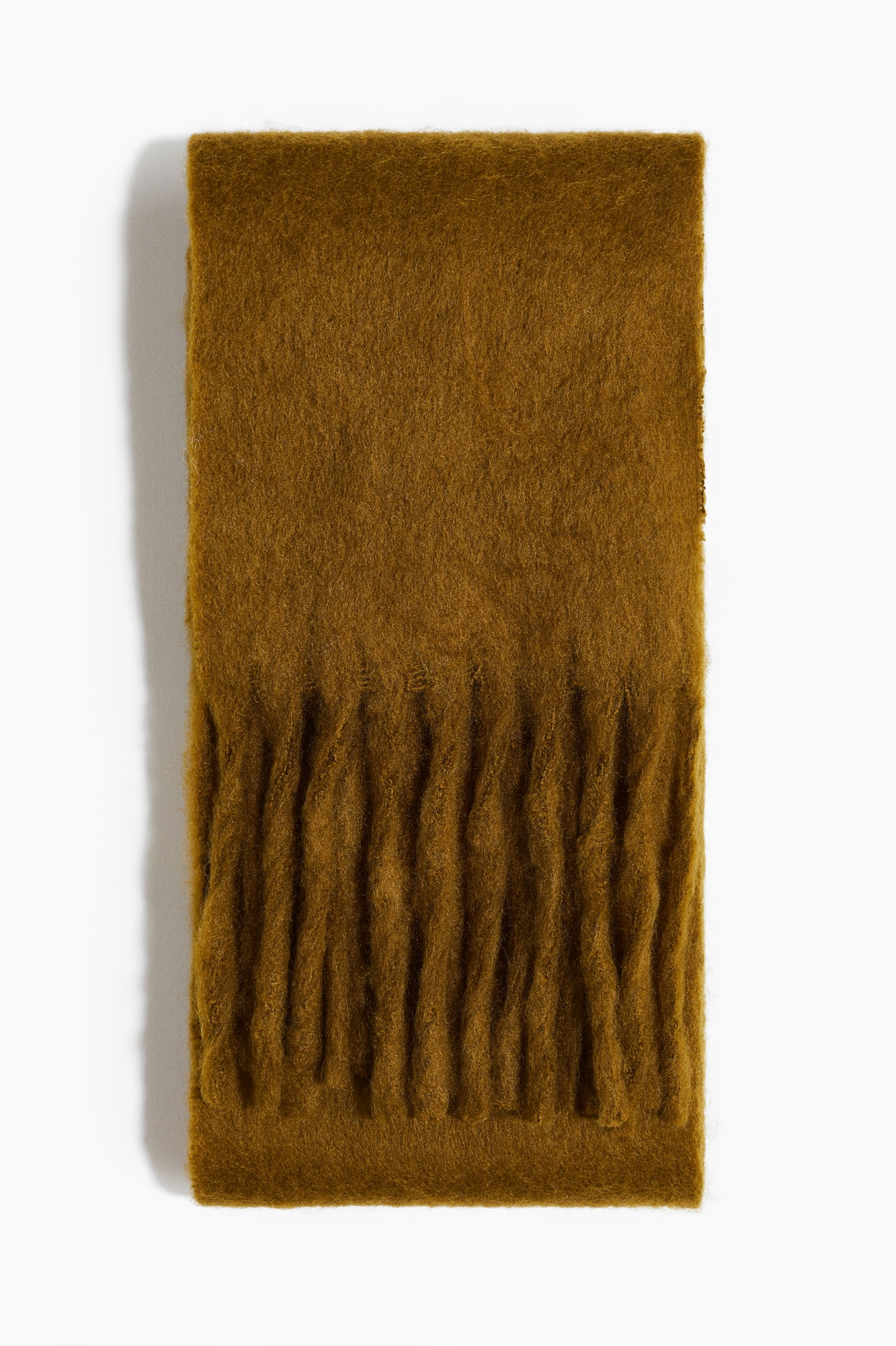 Шарф из мягкой пушистой ткани с длинной бахромой по коротким сторонам. Имеет небольшую аппликацию с тисненой монограммой.