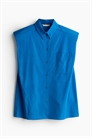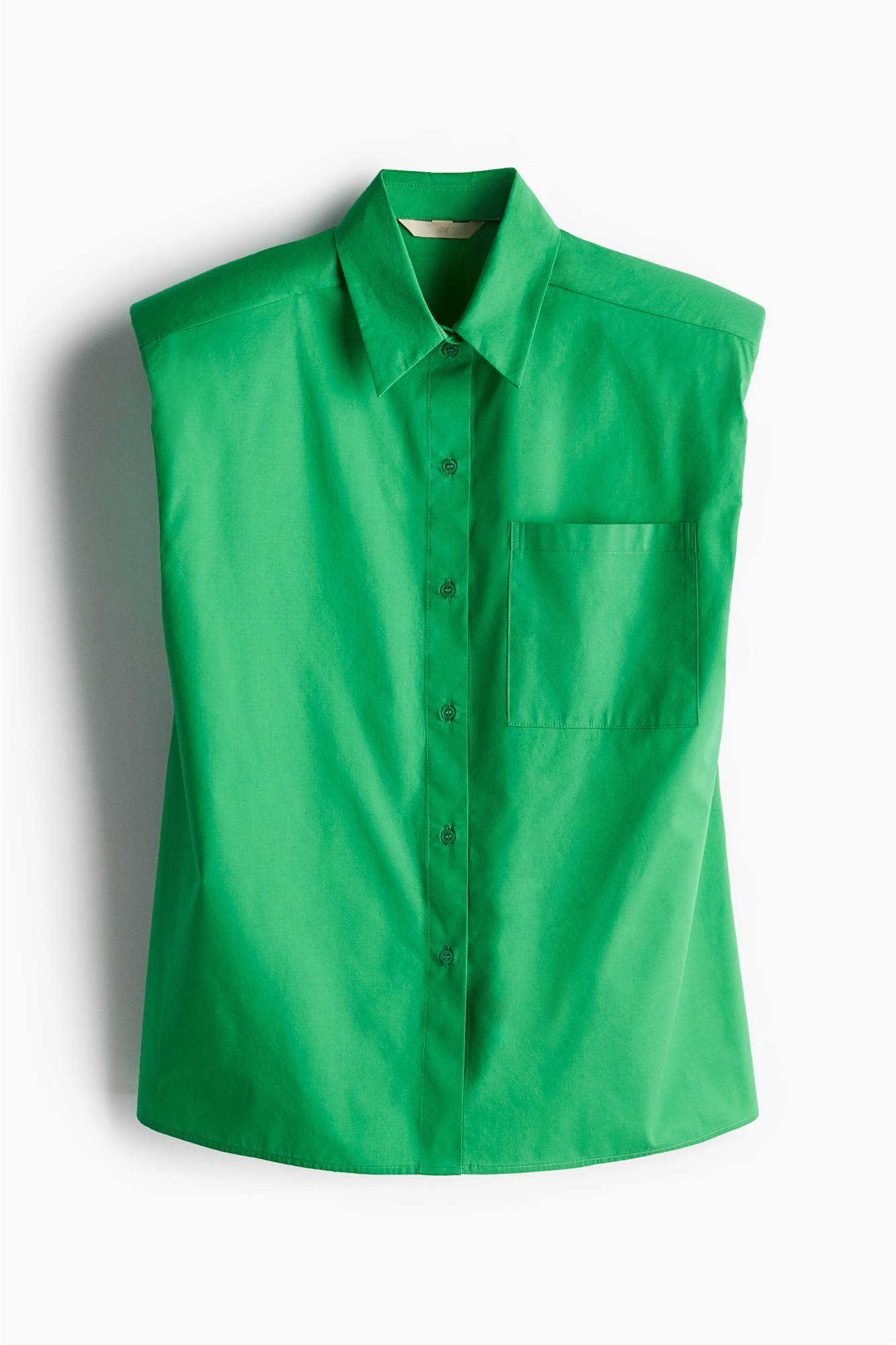Блузка без рукавов из нелиняющего хлопкового поплина. Модель свободного кроя, с воротником и застежкой на пуговицы. Накладки на плечах для придания формы, заднее ярмо и открытый нагрудный карман. Прямой подол.