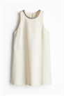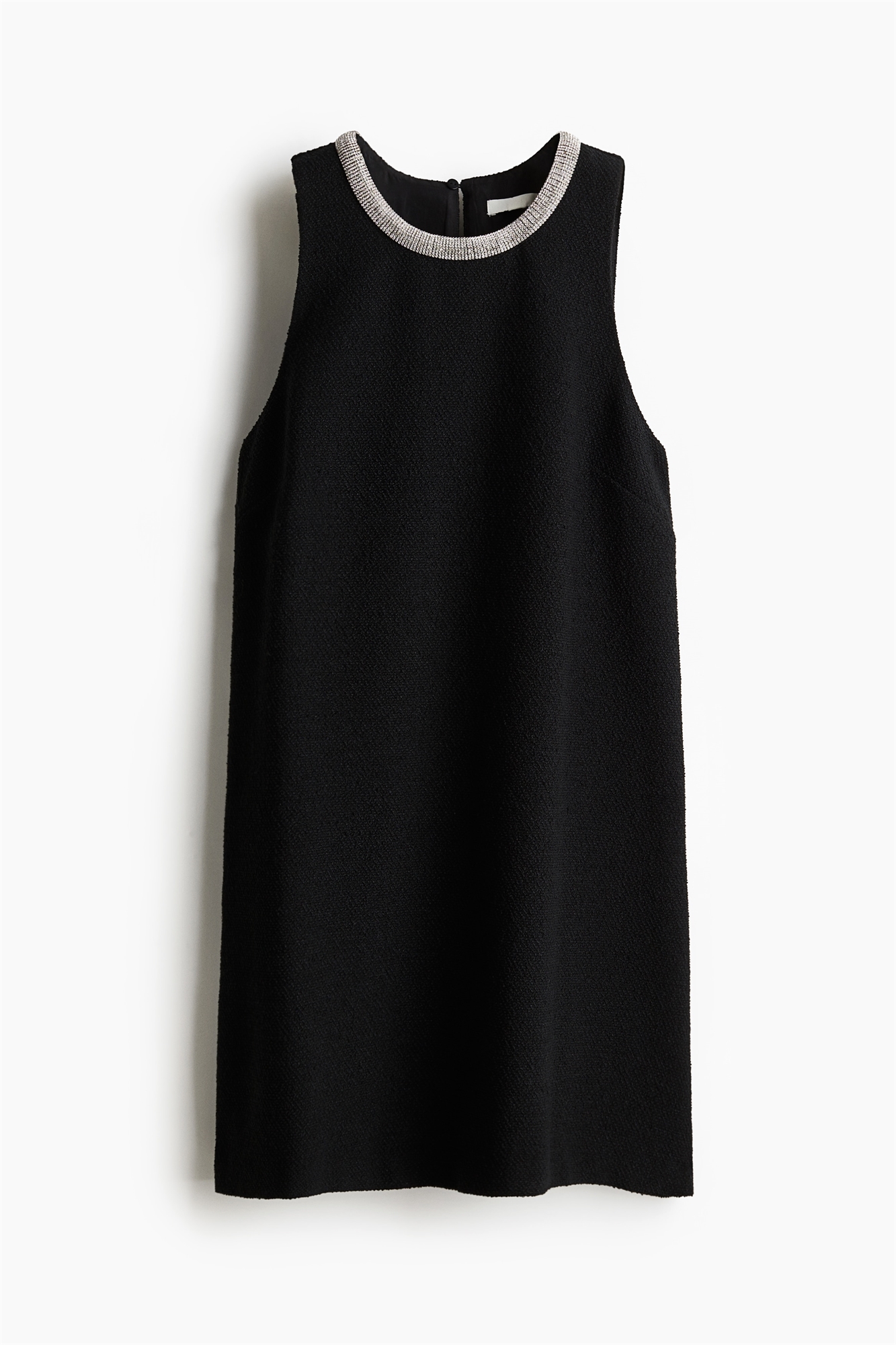 Короткое платье без рукавов из фактурного плетения с силуэтом А-линия. Круглый вырез горловины декорирован отделкой из сверкающих страз и отверстием для ключа с потайной пуговицей сзади на шее. Частично на подкладке.