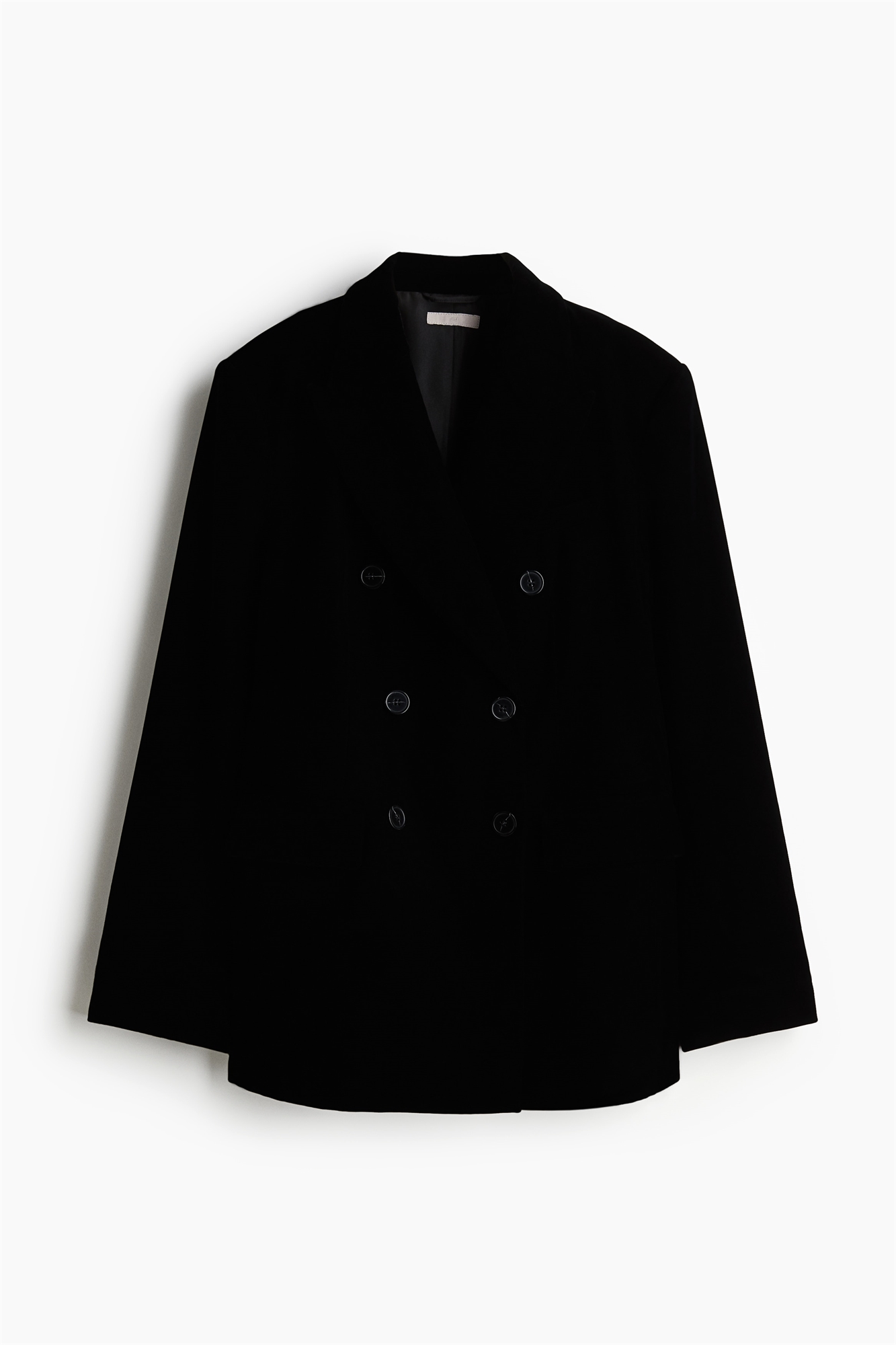 Длинный двубортный блейзер из мягкого бархата с пикообразными лацканами и пуговицами спереди. Нагрудный карман с клапаном и втачные передние карманы с клапаном. Тонкие подплечники, декоративные пуговицы на манжетах и один вентиляционный клапан сзади. На подкладке.