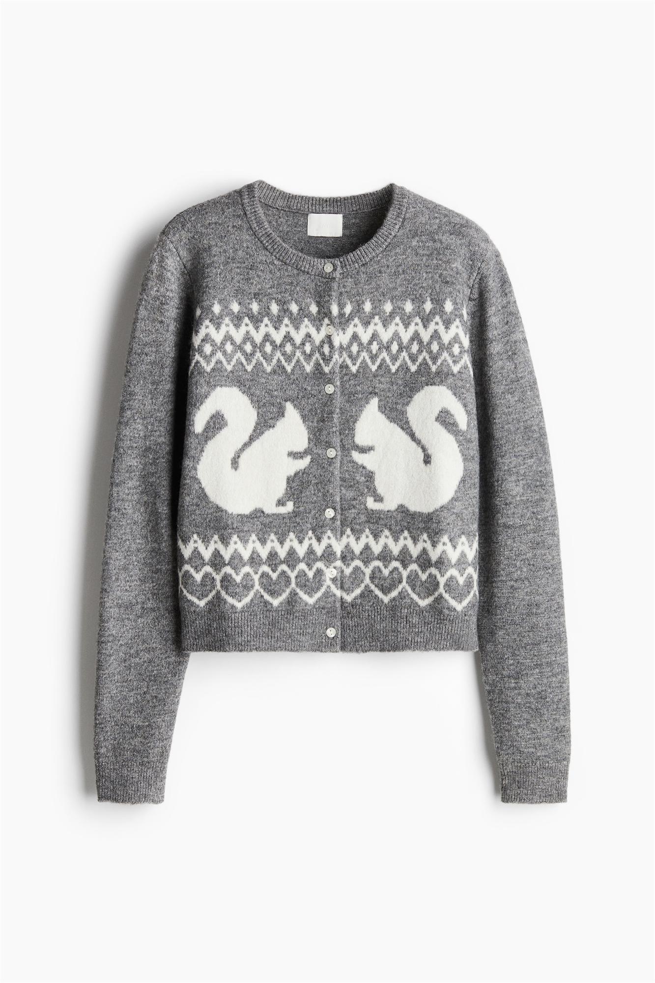 Короткий кардиган из мягкого жаккардового трикотажа с круглым вырезом, пуговицами спереди и длинными рукавами. Окантовка вокруг выреза, на манжетах и подоле.