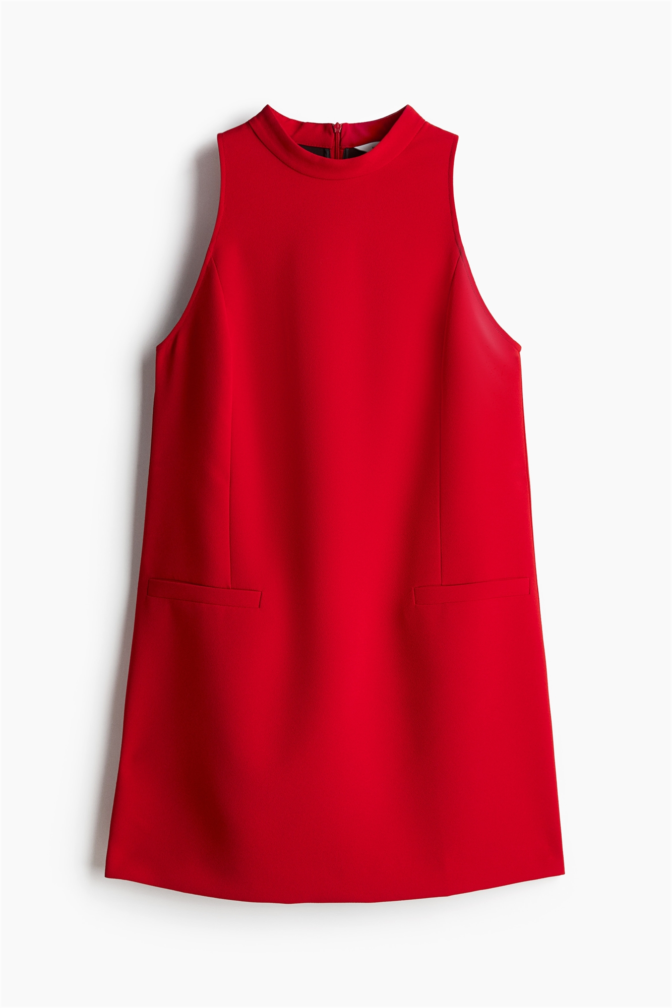Короткое платье без рукавов из тканого материала с легкой формой А-линии и узким разрезом в верхней части с небольшим воротником-стойкой и потайной застежкой-молнией сзади. Поддельные втачные карманы спереди и видимые швы спереди и сзади.