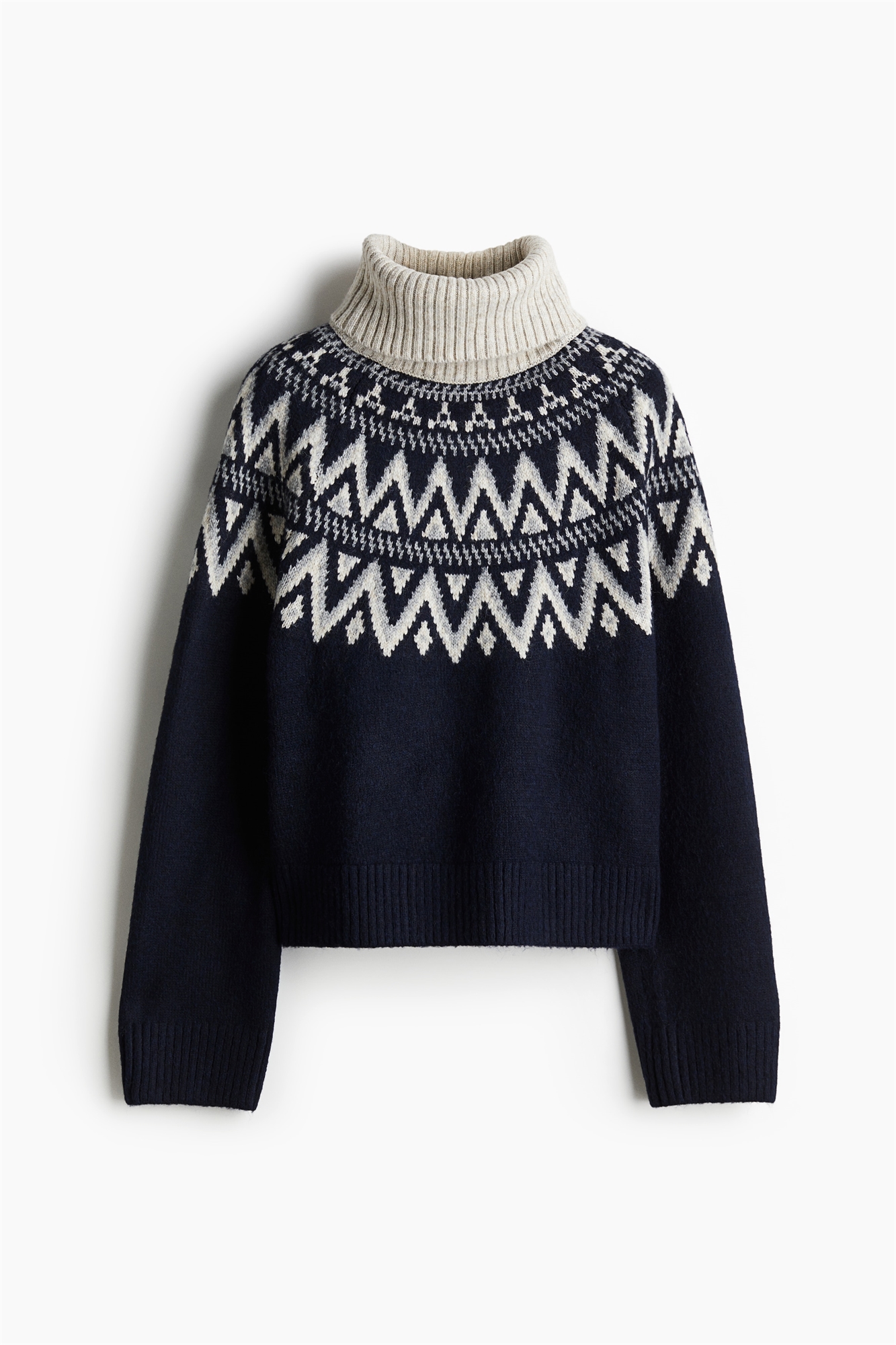 Джемпер свободного покроя из мягкого жаккардового трикотажа с ребристой горловиной-поло и длинными рукавами реглан. Манжеты и подол с ребрами жесткости.