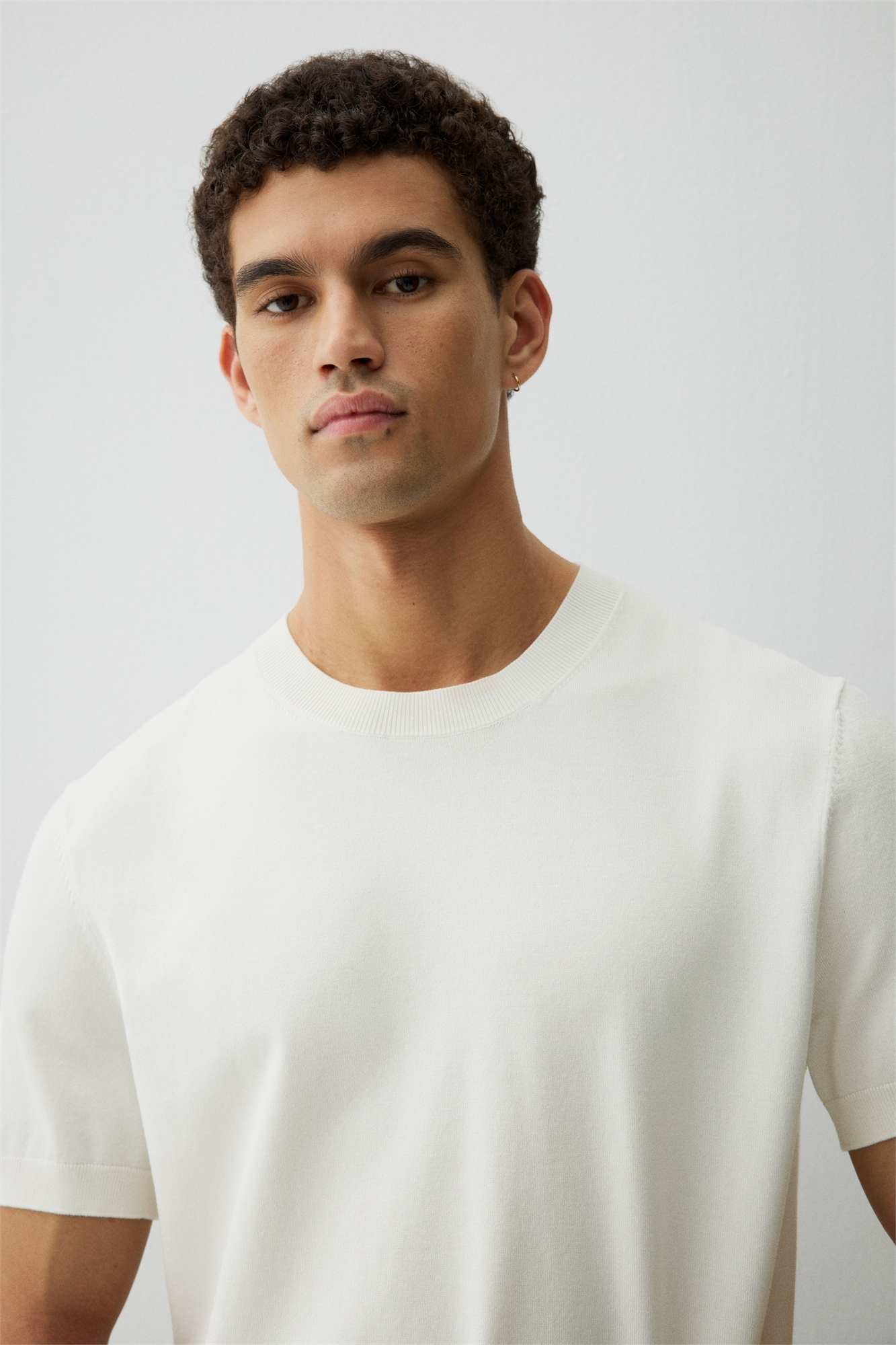 Футболка из мягкого тонкого трикотажа с окантовкой вокруг выреза, на манжетах и подоле. Зауженный крой, который облегает контуры тела, создавая приталенный силуэт.