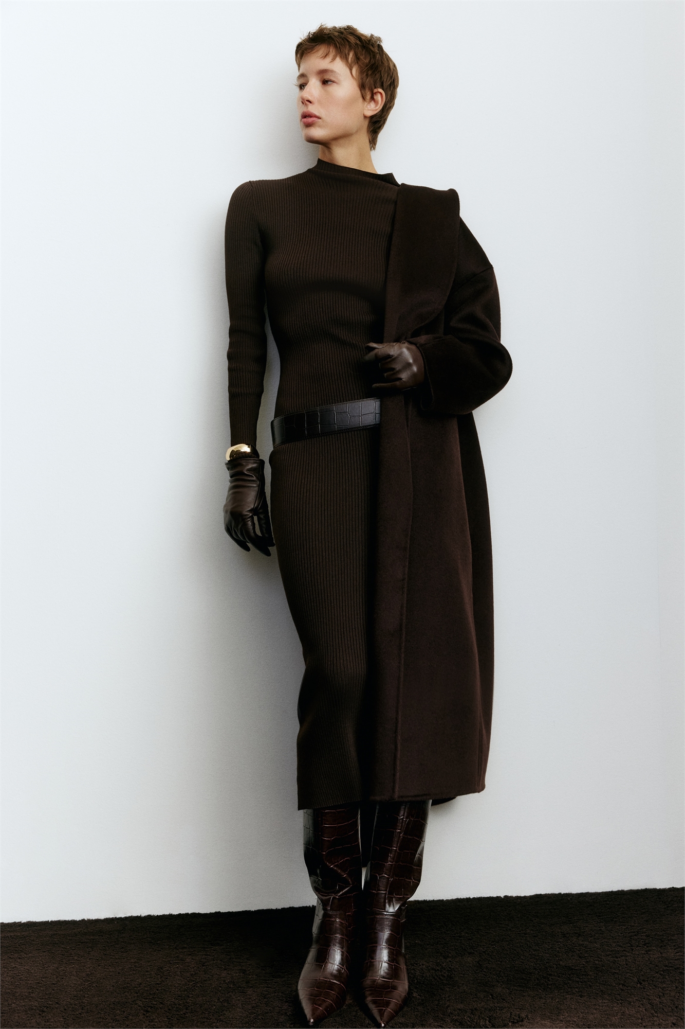 Длинное приталенное платье из мягкого трикотажа в рубчик с черепаховой горловиной и длинными рукавами.