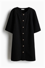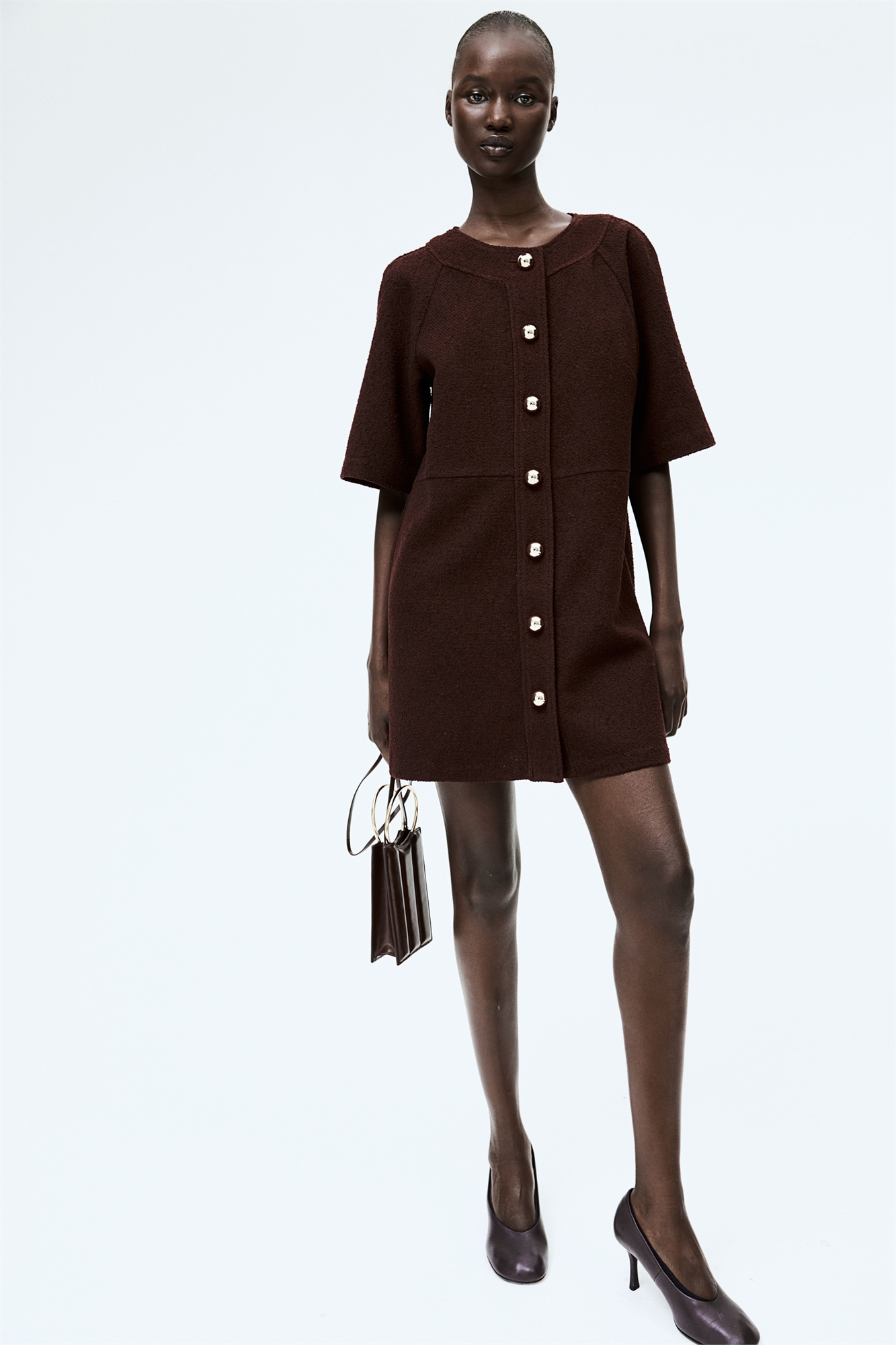 Короткое платье из легкого фактурного материала с добавлением шерсти. Круглый вырез, пуговицы золотистого цвета спереди и рукава реглан длиной до локтя. Без подкладки.