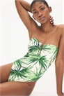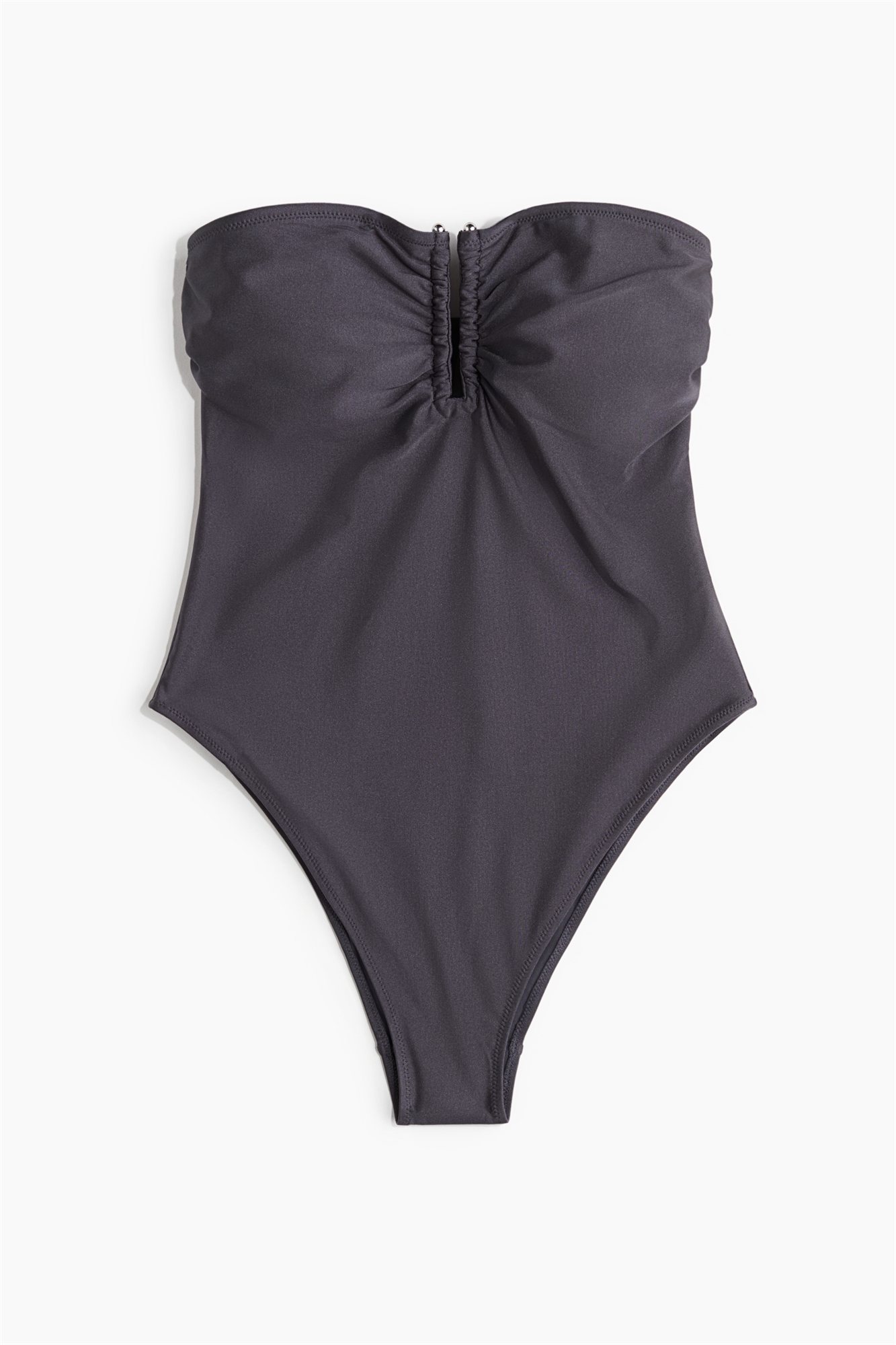 Полностью закрытый купальник-бандо со скрытой силиконовой отделкой в верхней части, закрытой металлической деталью в центре бюста и чашечками со съемными вкладышами, придающими форму бюсту и обеспечивающими хорошую поддержку. Ноги с высоким вырезом и среднее покрытие сзади.