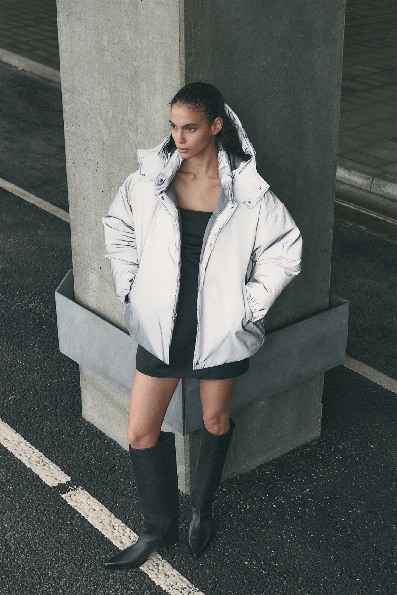 Куртка-пуховик из светоотражающей ткани с капюшоном со скрытыми кнопками спереди, воротником-стойкой и скрытыми кнопками спереди. Свободный крой с опущенными плечами, скрытая эластичная резинка на манжетах, втачные передние карманы и эластичный шнурок с ограничителями на подоле. На подкладке.