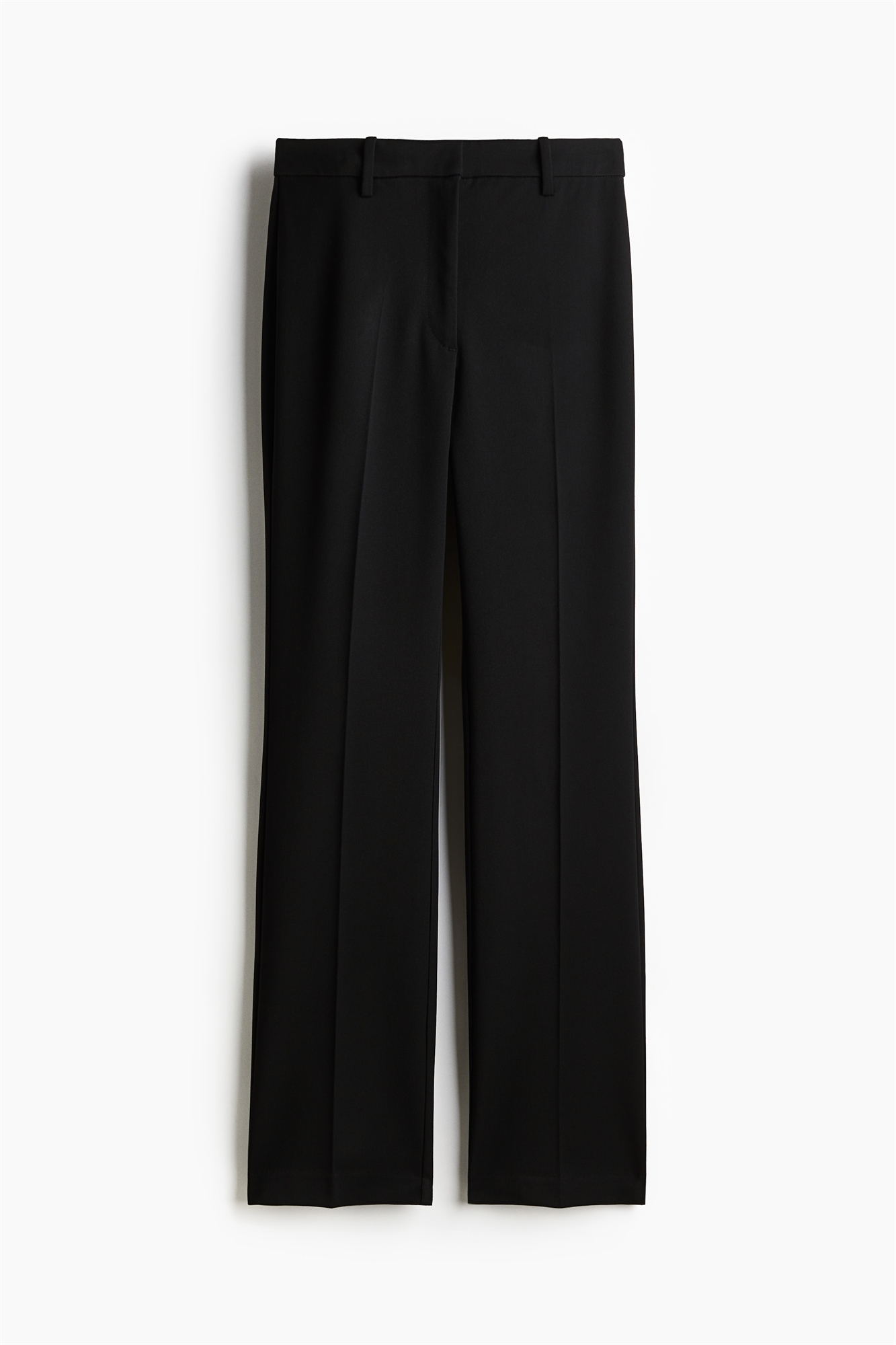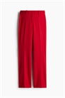 Брюки из саржи с высокой талией и ширинкой на молнии с потайной застежкой на пуговицу и крючок. Задние карманы и зауженные ноги со складками спереди и видимыми швами сзади, заканчивающимися разрезом на подоле.