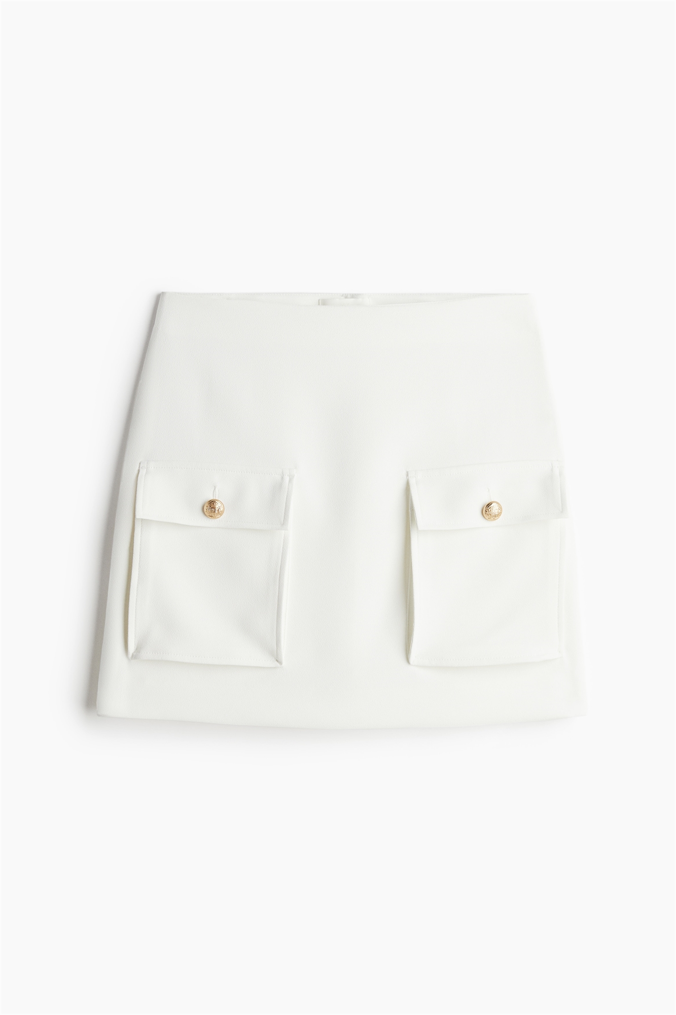 Короткая юбка из тканого материала с потайной застежкой на молнию с одной стороны на талии и втачными передними карманами с клапаном и пуговицей золотистого цвета.