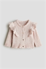 Кардиган из мягкого тонкого трикотажа с интегрированными металлическими нитями. Круглый вырез, ребристые воланы и металлические пуговицы спереди. Манжеты и подол с ребристыми краями.