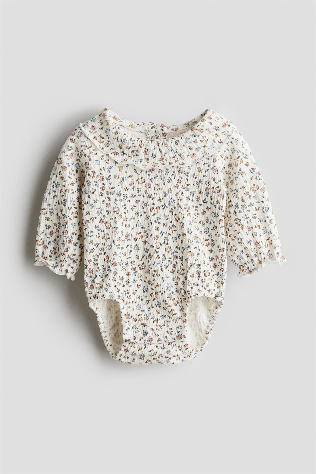 Боди-комбинезон с длинными рукавами из мятого трикотажа с жатым воротником. Отверстие и застежки на кнопках сзади на шее, а также застежки на кнопках в промежности для удобства переодевания. Оверлочные края воротника и манжет. Швы вокруг ножек для более удобного и плотного прилегания подгузника.