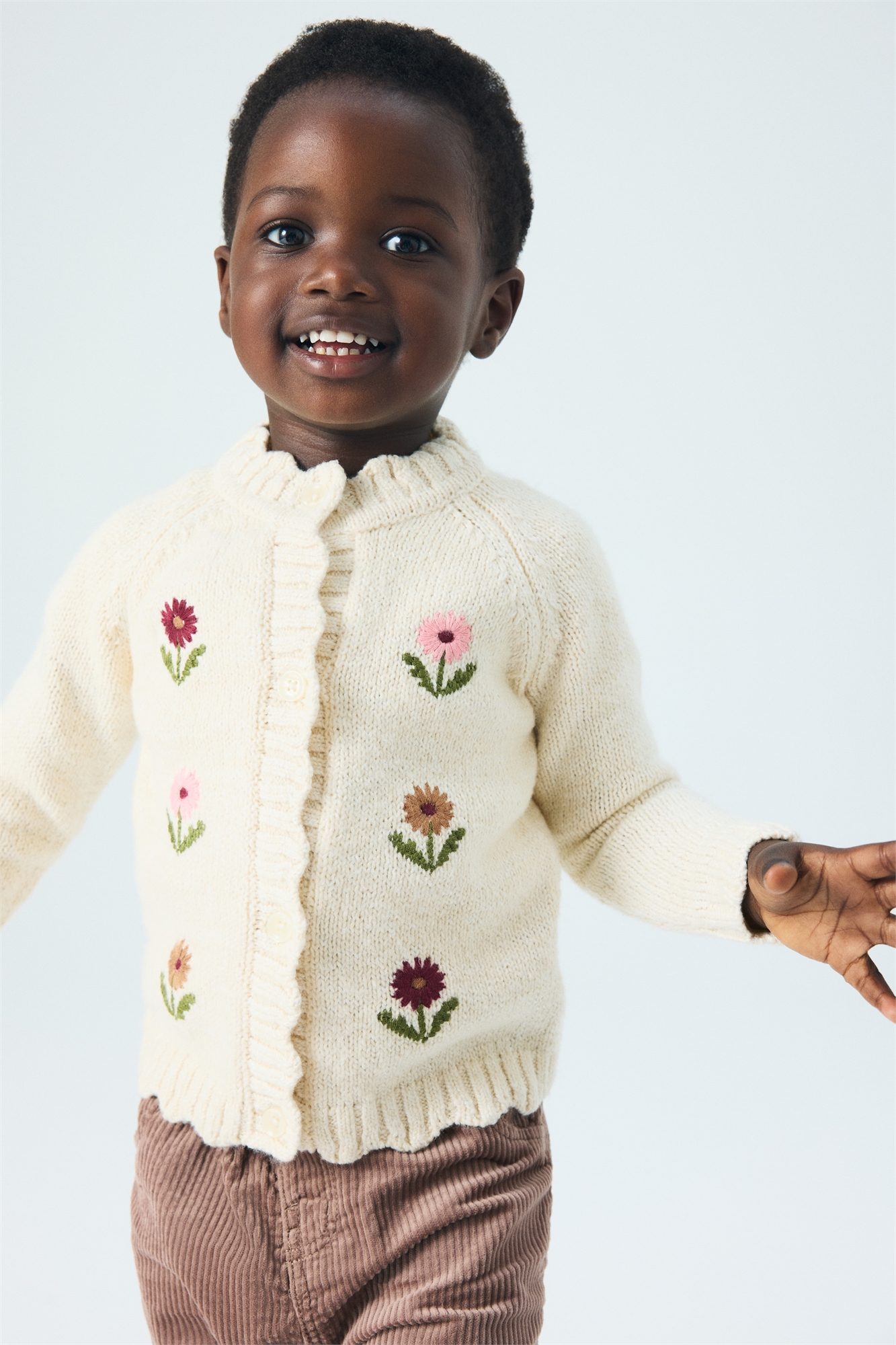 Кардиган из мягкого тонкого трикотажа с вышитыми деталями спереди. Круглый вырез, пуговицы спереди и длинные рукава реглан. Ребристая отделка в виде гребешков на вырезе, пуговицах, манжетах и подоле.