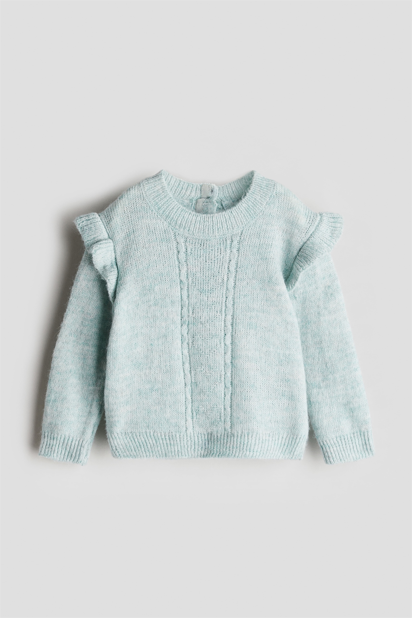 Джемпер с длинными рукавами из мягкого тонкого трикотажа с круглым ребристым вырезом и пуговицами сзади. Спущенные плечи с отделкой воланами, манжеты и подол в рубчик.