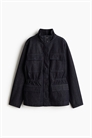 Куртка из хлопковой саржи с воротником-стойкой, застежкой-молнией и ветрозащитным клапаном с кнопками спереди. Спущенные плечи и потайной шнурок с ограничителями на талии. Накладные нагрудные и передние карманы с потайной кнопкой. Без отделки.