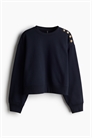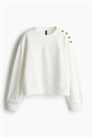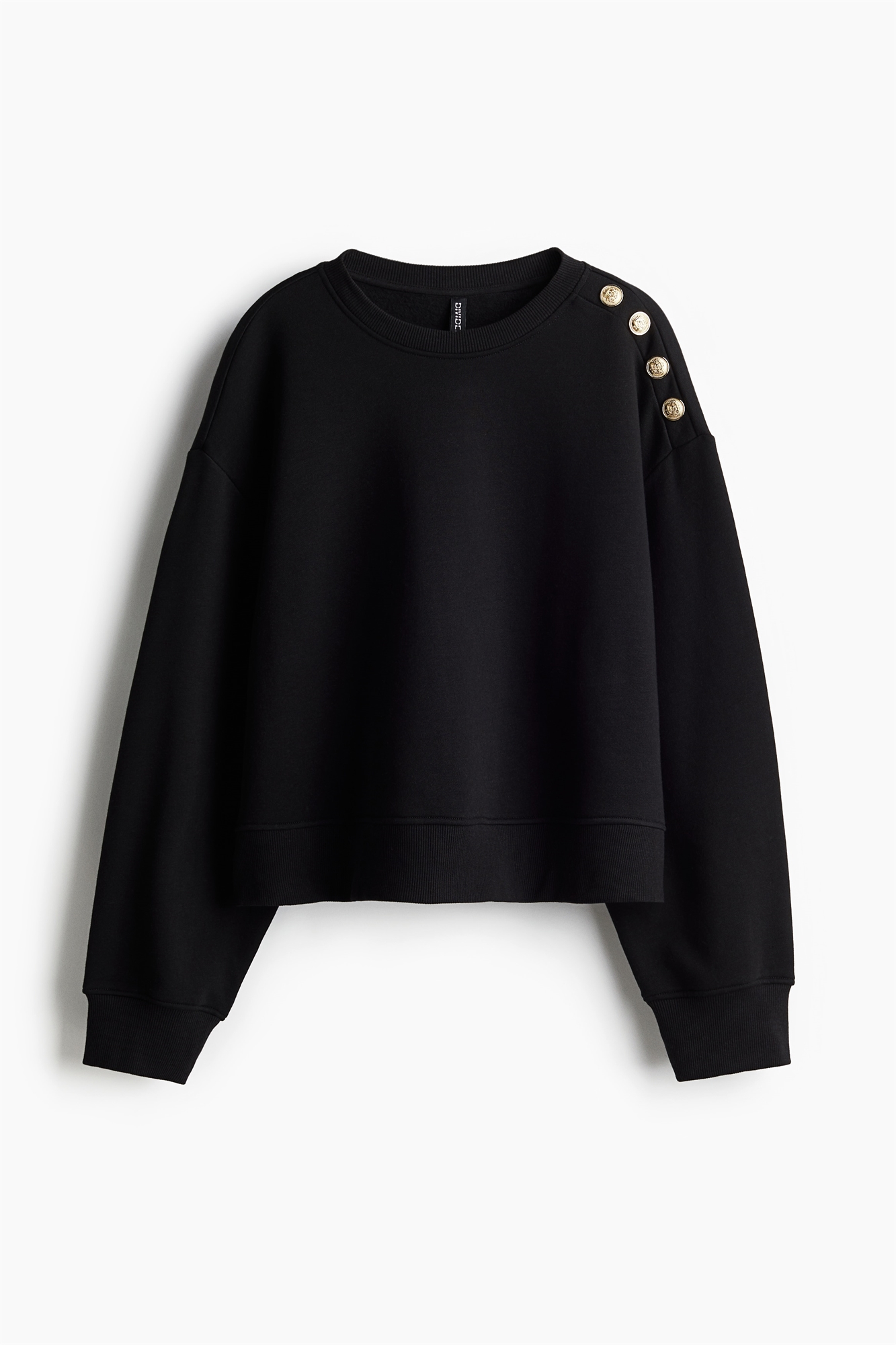 Свободный, слегка укороченный топ из толстовочной ткани с мягкой начесом внутри. Металлические пуговицы золотого цвета на одном плече, низкие спущенные плечи и длинные рукава. Окантовка по вырезу горловины, манжетам и подолу.