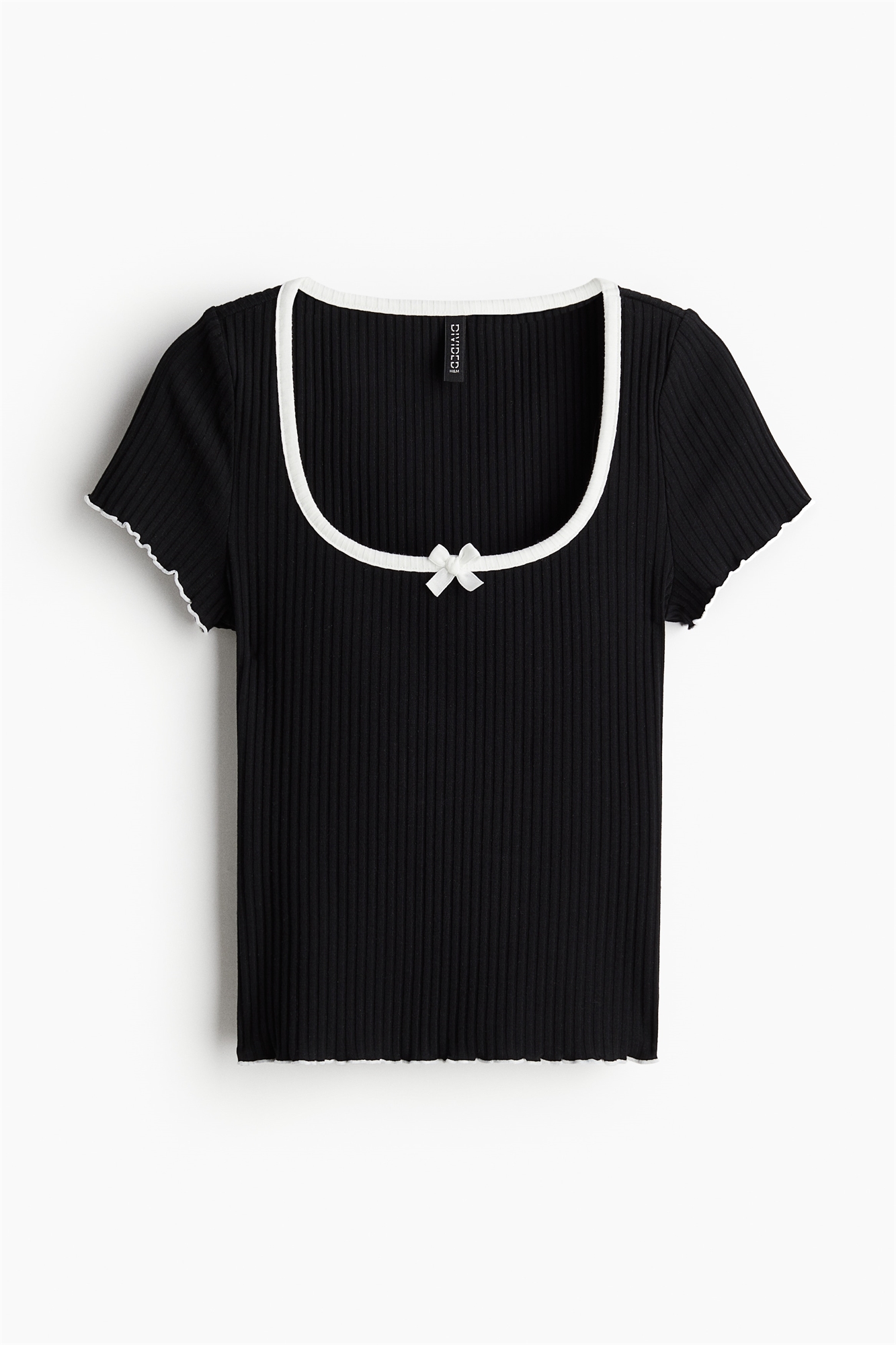 Облегающий топ из ребристого трикотажа с глубоким круглым вырезом и короткими рукавами. Узкая окантовка вокруг выреза, маленький атласный бант в центре бюста и оверлоки на манжетах и подоле акцентного цвета.