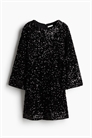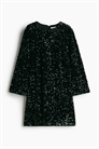 Короткое платье А-линии из блестящего велюра с круглым вырезом и потайной застежкой на молнию и крючок-глаз сзади на шее. Расклешенные рукава реглан длиной 3/4. Подкладка из джерси.