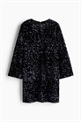 Короткое платье А-линии из блестящего велюра с круглым вырезом и потайной застежкой на молнию и крючок-глаз сзади на шее. Расклешенные рукава реглан длиной 3/4. Подкладка из джерси.