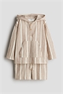 Комплект из двух частей: толстовка и шорты из мягкой хлопковой ткани. Толстовка с длинными рукавами, капюшоном на подкладке, застежкой на пуговицы, спущенными плечами и карманом-кенгуру. Шорты с эластичной утягивающейся талией.