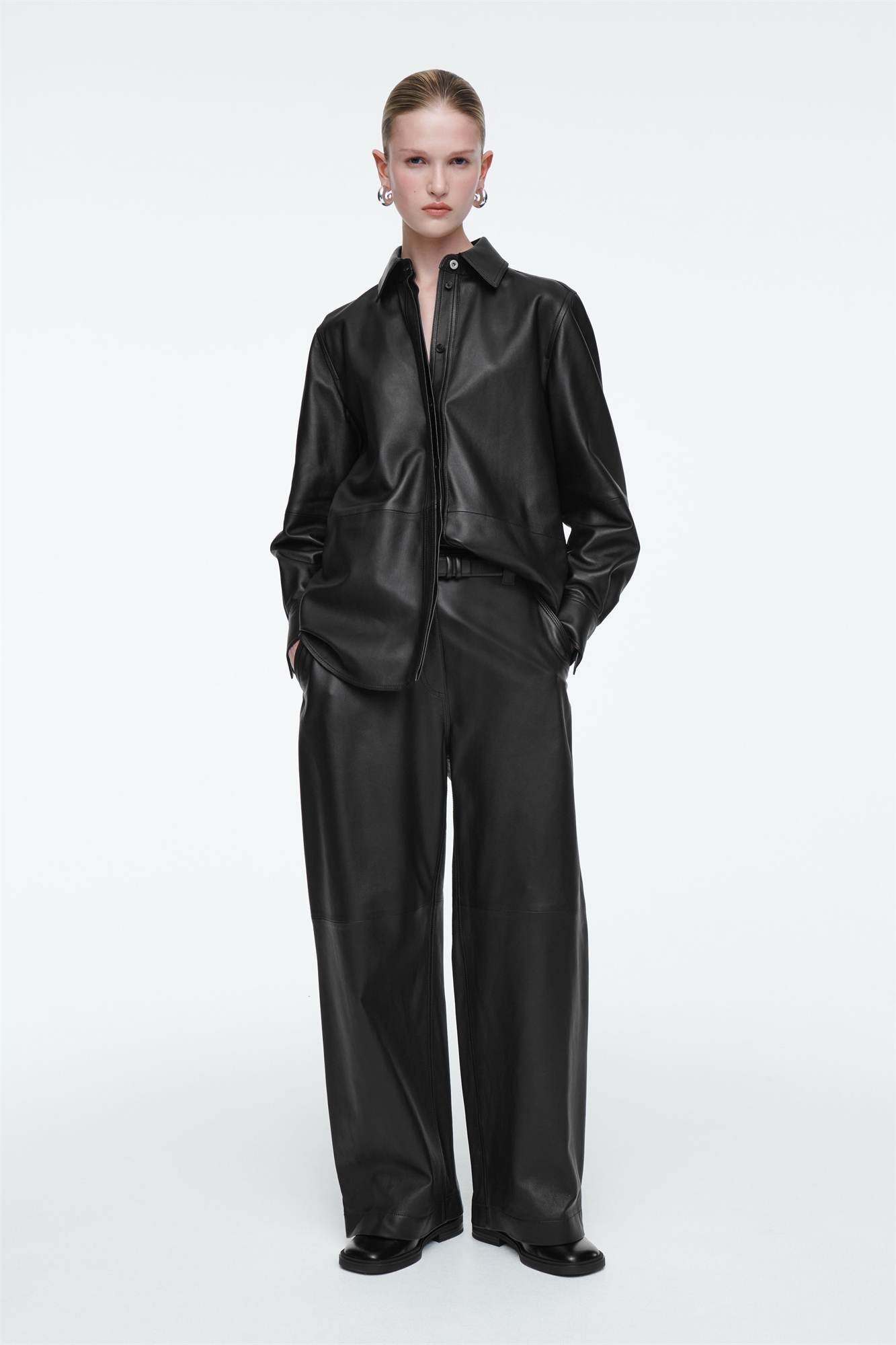 В этом сезоне классические кожаные брюки переосмыслены через призму практичности. Они выполнены из бесхромовой кожи и имеют непринужденную форму с регулируемыми пуговицами на подоле. Они легко сочетаются с рубашками, футболками и трикотажем. Свободный крой Застежка на пуговицах и молнии COS поддерживает ответственное производство через Leather Working Group Материал: 100% кожа. Без учета отделки / Чистка специалистом Внутренняя длина ноги размера EU 36 составляет 74,6 см / Модель носит размер EU 36