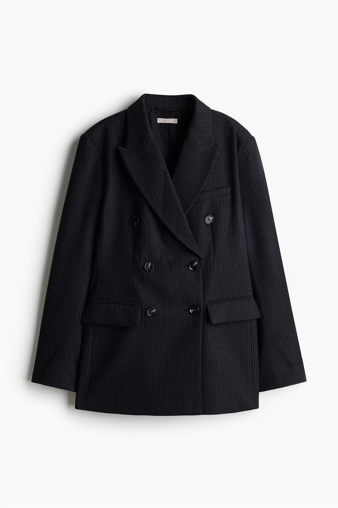 Двубортный блейзер из тканого материала с пикообразными лацканами и пуговицами спереди. Тонкие подплечники, длинные рукава с декоративными пуговицами на манжетах, нагрудный карман и втачные передние карманы с клапаном. Одиночная вентиляция на спине. На подкладке.